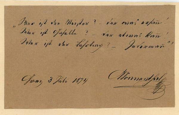 120 x 75 mm. Auf Trägerkarton. Wer ist der Meister? - Der was ersann! Wer ist Geselle? - Der etwas kann! Wer ist der Lehrling? - Jedermann!. - Der in Pest geborene Schauspieler wurde 24jährig 1856 von Heinrich Laube an das Wiener Hofburgtheater engagiert, "spielt den Mortimer und fällt durch. Laube läßt sich indes nicht beirren, gibt ihm einen dreijährigen Kontrakt, und ehe der abläuft, ist er zum k. k. Hofschauspieler ernannt [.] er wird zum meistbeschäftigten Mitglied des Burgtheaters: 160 Vorstellungen pro Saison. Heimlich verlobt mit der reichen Pauline Pappenheim, heiratet er sie erst, als die Familie verarmt, er aber schon konsolidiert ist [.] 1881 verleiht ihm Kaiser Franz Joseph die Eiserne Krone I. Klasse, die damals noch mit dem erblichen Adel verbunden ist. Arthur Schnitzler meint Sonnenthal, wenn er im 'Grünen Kakadu sagen läßt: 'Einer, der uns vorspielen kann, was er will, ist doch mehr als wir alle'" (Haeusserman, Das Wiener Burgtheater, Wien u. a., Molden, 1975, S. 57). Vgl. Öst. Lex. II, 409 und Czeike V, 250f.