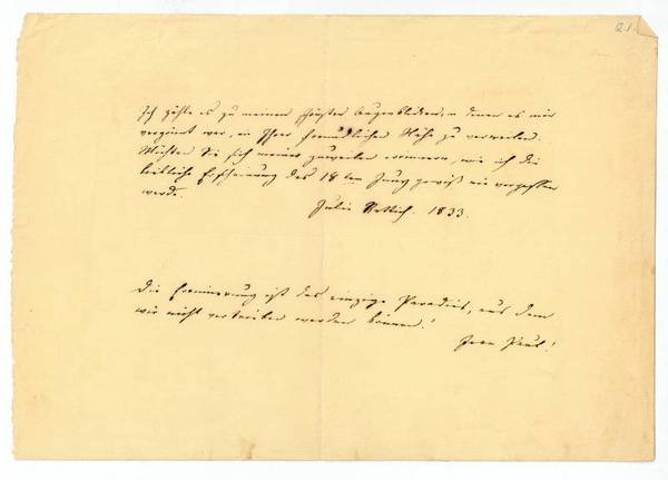 1 S. Qu.-8vo. Ich zähle es zu meinen schönsten Augenblicken, in denen es mir vergönnt war, in Ihrer freundlichen Nähe zu verweilen. Möchten Sie sich meiner zuweilen erinnern, wie ich die liebliche Erscheinung des 18ten Juny gewiß nie vergessen werde […]. - Die in Hamburg geborene Schauspielerin nahm Unterricht bei Ludwig Tieck und debütierte 1825 am Hoftheater in Dresden. Nach Gastspielen in Prag, Hamburg und 1828 am Wiener Burgtheater erlangte sie ihren ersten großen Erfolg 1829 als Gretchen in Goethes "Faust". "Nach Gastspielen in Berlin und Wien gehörte sie von 1830 bis 33 und seit 1835 als Nachfolgerin Sophie Schröders dem Ensemble des Burgtheaters an. Rettich hatte durch ihre Freundschaft mit der Erzherzogin Sophie Einfluß auf Theater und Hof in Wien und verhalf Friedrich Halm durch ihre Darstellung der Griseldis zu seinem Erfolg. In ihrem Salon verkehrten u. a. Eduard von Bauernfeld, Franz Grillparzer, Friedrich Hebbel, Heinrich Laube und Adalbert Stifter. Rettich gilt neben Sophie Schröder und Charlotte Wolter als dritte bedeutende Burgschauspielerin des 19.Jahrhunderts" (DBE).