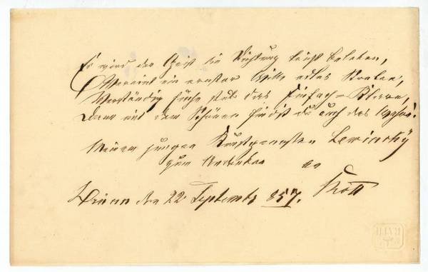 1 S. Qu.-8vo. Seinem "neuen jungen Kunstgenossen Lewinsky" (wohl Schauspieler und Regisseur Josef Lewisnky, 1835-1907): "Es wird der Geist die Dichtung sanft belehren, / Vereint ein ernster Wille edles Streben, / Verständig suche stets das Einfach-Klare, / dann mit dem Schönen find'st du auch das Wahre!".