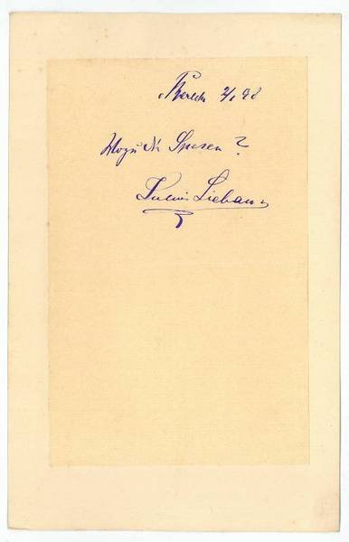 ½ S. 8vo. auf Trägerkarton. Wozu die Spesen? - Zum Zeitpunkt der Widmung war Lieban als Tenorbuffo Mitglied der Hofoper in Berlin. - Auf Trägerkarton.