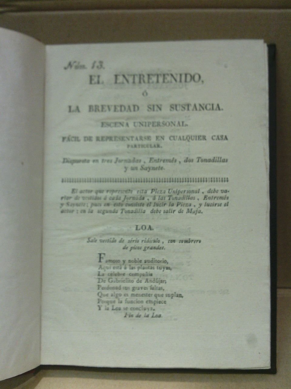 El Entretenido, ó La brevedad sin sustancia. (Escena unipersonal, facil de representarse en cualquier casa particular. Dispuesta en tres Jornadas, Entremés, dos Tonadillas y un Saynete)