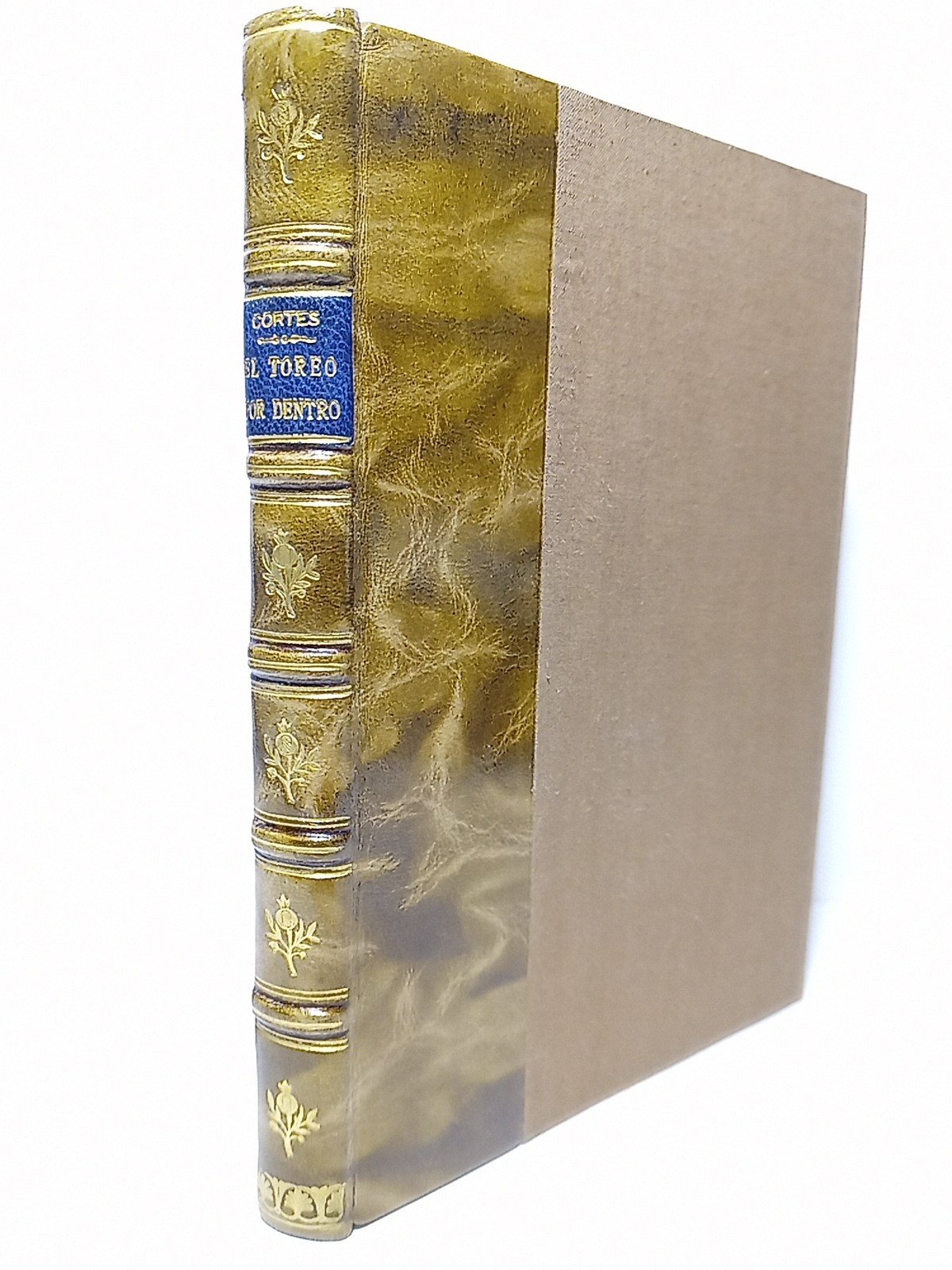 [PRIMERA EDICION].- Málaga: Imprenta Dardo, 1953.- 200 p., [3 h.]: 12 láminas fotográficas en negro; 4º menor (21,5 x 15,5 cm); Finamente encuadernado en Media Piel valenciana, lomo dorado, tejuelo, cabeza tintada, conservando sus cubiertas originales.- RARO ejemplar.* Con una dedicatoria autógrafa del autor tras la cubierta anterior original. Libro en excelente estado. TAUROMAQUIA