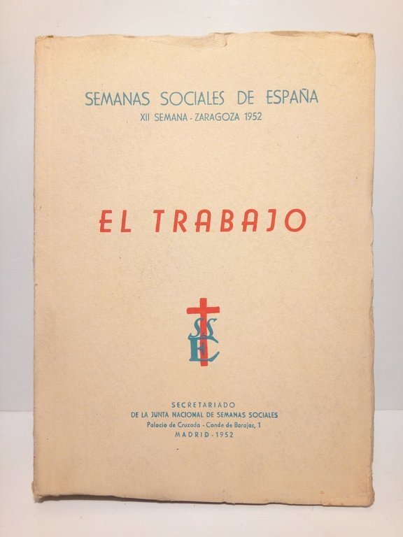 Madrid: Secretariado de la Junta Nacional de Samanas Sociales, 1952.- 541 p.; 4º menor (21,5 x 15,9 cm); Cartulina Ed.- Con 20 importantes estudios sobre el tema, escritos por especialistas en la materia.* TRABAJO, DERECHO LABORAL, SOCIAL Y RELACIONES CON LA EMPRESA