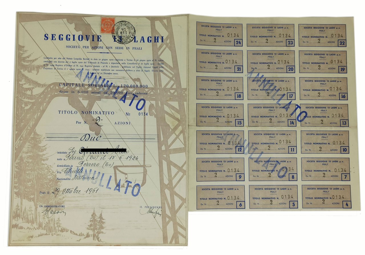 TITOLO AZIONARIO, ANNULLATO, DELLA SOCIETA' PER AZIONI CON SEDE IN PRALI 'SEGGIOVIE 13 LAGHI'