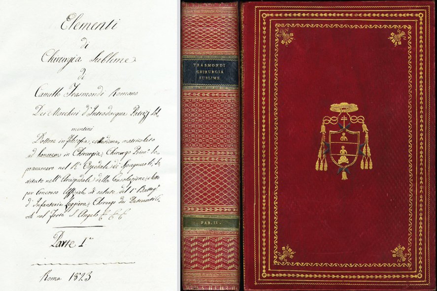 >2 volumi in-4 grande (315x218 mm.), di ff.(6), 122, (2) il primo; di pp.698 il secondo. Splendida legatura del tempo in pieno marocchino rosso a grana lunga, piatti finemente ornati da cinque bordure floreali o a filetti oro, dorsi riccamente ornati e con doppio tassello verde per il titolo, armi araldiche del cardinale Bartolomeo Pacca (1756 - 1844) impresse in oro al centro dei piatti, tagli dorati. Testo manoscritto in inchiostro bistro scuro su carta forte, in calligrafia assai differente per ogni volume: il primo, autografo, vergato in lettere corsive, con dedica su tre pagine ''A Sua Em.za Ecc.ma il Cardinal Bartolomeo Pacca Camerlengo di S.Chiesa...Roma li 15 Agosto 1823''. Il secondo scritto in calligrafia retta, con la dedica autografa posta in basso dell'ultima pagina, firmata ''...Cavalier D.Camillo Dottor Trasmondi''. Esemplare unico di un interessante trattato manoscritto di medicina rimasto inedito. Anche dell'autore non si reperiscono notizie biografiche. Nel titolo della parte prima si dichiara ''Camillo Trasmondi Romano dei Marchesi d'Introdacqua Patrizi Solmontini, dottore in filosofia, e medicina, matricolato ad honorem in chirurgia, chirurgo prim.o sopranumero nel r.o Ospedale de' Spagnuoli. sostituto nell'Arcispedale della Consolazione...''. Opera interessante per la materia e le conoscenze mediche all'inizio del secolo XIX, in artistica legatura alle armi, in perfetto stato di conservazione.