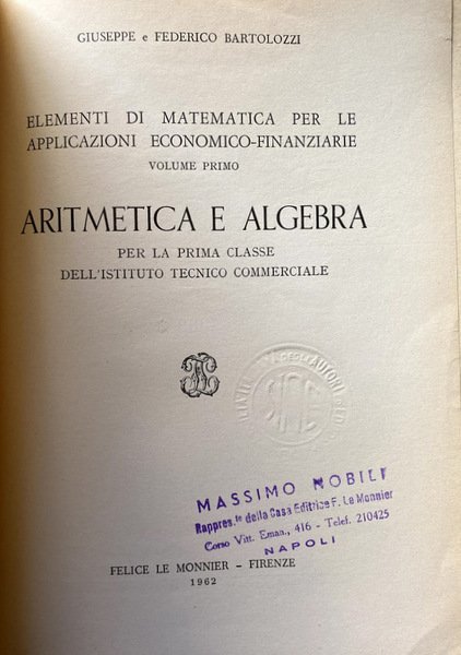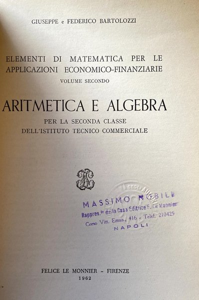 ELEMENTI DI MATEMATICA PER LE APPLICAZIONI ECONOMICO-FINANZIARIE. ARITMETICA E ALGEBRA PER LA PRIMA CLASSE, PER LA SECONDA CLASSE DELL'ISTITUTO TECNICO-COMMERCIALE. (VOLUME 1, VOLUME 2)