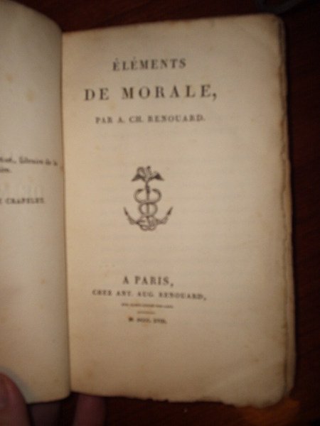 E.O. Un volume (10,5x17,5 cm) di (4)-V-215 pagine. In barbe. Brossura in carta marmorizzata. Augustin-Charles Renouard, figlio dell'editore e bibliofilo Antoine-Augustin Renouard, scrisse questo volume quando aveva appena 24 anni: partecipando al concorso indetto dal governo francese con 1000 franchi di premio per un'opera nella quale si dovevano "tracer avec semplicitè, precision et sagesse, les princxipes de la religion chretienne, de morale, de prudence sociale", e che sarebbe stato diffuso nelle scuole. Renouard arrivò in realtà secondo (il primo premio venne vinto da Laurent de Jussieu con il suo Simon de Nantua, vedi in questo catalogo anche quella E.O.), ma fu il padre a stampare l'opera, che è oggi assai rara. Renouard ebbe poi una grande carriera nel campo della politica e del diritto nella Francia del XIX secolo, diventando il padre del diritto d'autore.
