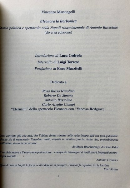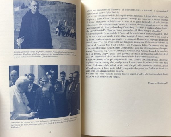 Soggetti: Teatro, Antonio Bassolino, Roberto De Simone, Carlo Azeglio Ciampi, Rosa Russo Iervolino, Sindaci napoletani, Ex-sindaco, Rinascimento napoletano, Eleonora Pimentel Fonseca, Martiri rivoluzionari, Giornali, Intellighenzia, Spettacolo, Vanessa Redgrave, Rivoluzione napoletana, 1799, Repubblica Partenopea, Attualità, Intellettuali, Politica, Vita culturale cittadina, Borbone, Neo-borbonici, Musica, Costume, Società, San Carlo, Giacobini, Palcoscenico, Messinscena, Rappresentazione, Umorismo, Percy Allum, Eduardo De Filippo, Cronache napoletane, Guide, Atti, Foyer, Meridionalismo, Camorra, Mafia, Borghesia, Geografia, Quartieri, Jean Noel Schifano, Grenoble, Vesuvio, Oleografia, Sontag, Knight, Villa Comunale, Voci di dentro, Macciocchi, Squitieri, Sanfelice, Regno, Maschere, Pulcinella, Glamour, Moda, Eventi, Totò, Peppino, Libri Vintage, Fuori catalogo, Storia locale, Theater, Neapolitan Mayors, Ex-mayor, Neapolitan Renaissance, Revolutionary Martyrs, Newspapers, Entertainment, Neapolitan Revolution, Neapolitan Republic, Current Affairs, Intellectuals, Politics, Cultural life in the city, Neo-Bourbon, Music, Society, Jacobins, Stage, Staging, Performance, Humor, Neapolitan Chronicles, Guides, Acts, Meridionalism, Bourgeoisie, Geography, Neighborhoods, Vesuvius, Oleography, Voices from within, Kingdom, Masks, Fashion, Events, Books Out of Print, History local