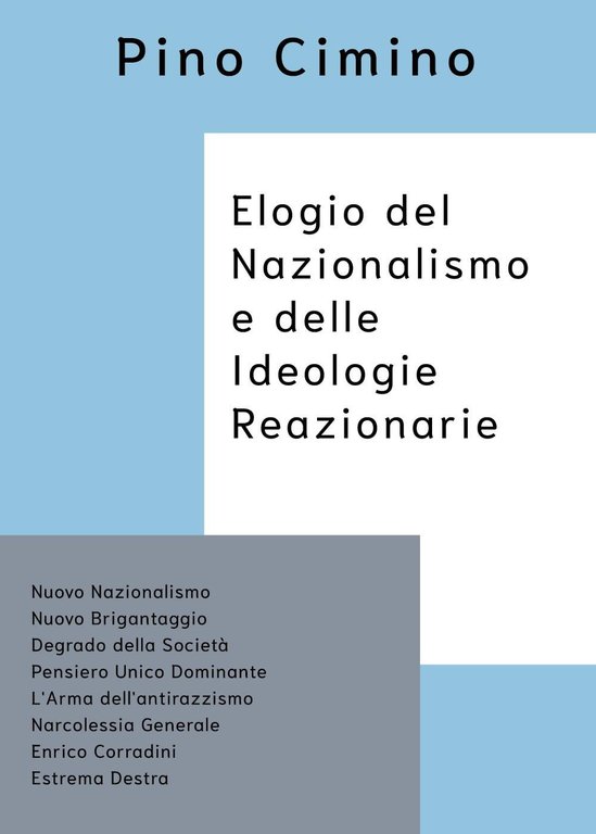 "Elogio del Nazionalismo e delle Ideologie Reazionarie" è un breve saggio di opinionistica politica nel quale si evidenzia il fatto che tali correnti di pensiero sono, oggi, fortemente avversate da mostruosi totalitarismi come l'Unione Europea o come quella numerosa e consistente parte della società italiana che vorrebbe l'abolizione dei confini e con essi la cessazione del significato della parola straniero. In una nazione nella quale degrado, violenza ed ingiustizia sono in esponenziale aumento e nella quale la società civile è divisa tra posizioni ideologiche opposte, ci si chiede quali benefici potrebbe avere il popolo italiano se questi si unisse a difesa della propria cultura identitaria e dei propri interessi e se il Nazionalismo, il Nuovo Nazionalismo, fosse la risposta agli attuali problemi che attanagliano la Repubblica Italiana. Nessuno, dunque, vuol più essere padrone a casa propria?