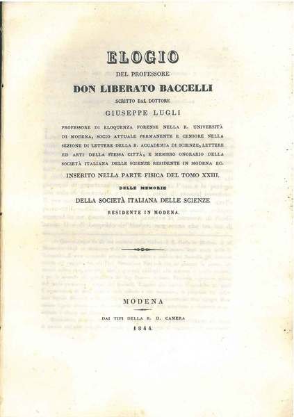 Elogio del professore Don Liberato Baccelli. inserito nella parte fisica del tomo XXIII delle memorie della Società italiana delle scienze residente in Modena