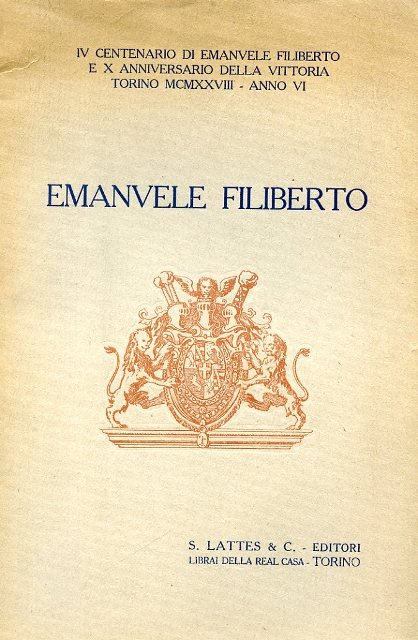 In-4°, pp. XXX, brossura editoriale con stemma sabaudo. Ritratto di Emanuele Filiberto in b.n. applicato all'antiporta, riproducente il noto dipinto dell'Argenta conservato alla Galleria Sabauda. Intonso.