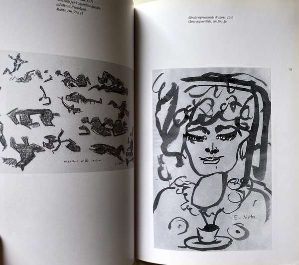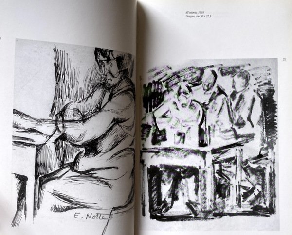 Emilio Notte, dal Futurismo fino agli anni Settanta, da quale emerge “il suo talento disegnativo: straordinario perché capace di tutte le virtualità del disegno, che ora si arrende estenuato e filante, come nelle raffigurazioni del rifugio antiaereo di Materdei; ora è libero, ribelle e persino anarchico, ed è il caso di una Ballerina forse del ’20; ora piega l’armonia d’una figura alle ragioni della geometria, ed è il caso di alcune sanguigne; ora s’informa d’inaudita potenza: ed è il caso dei Bevitori e della Popolana e di Osteria, datati al ’18 e al ’19, nonché del grande pastello Interno con tavolino del Settecento (’59), dei paesaggi di Vulcano e delle nature morte neo-cubo-futuriste eseguite con matitone anch'esse agli esordi degli anni Sessanta: Bottiglia e fiore e Brocca con bottiglia, bicchiere e frutta”. (Filomena M. Sardella, Vent'anni dopo, contributo in catalogo della mostra).