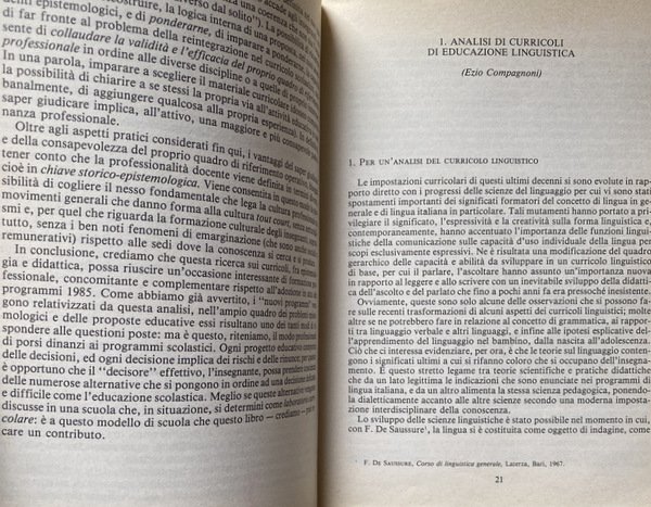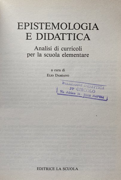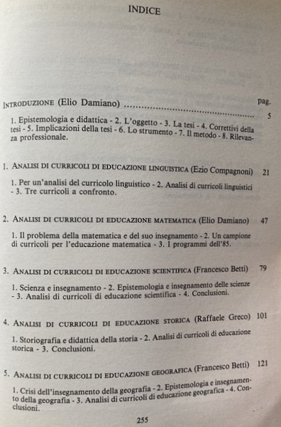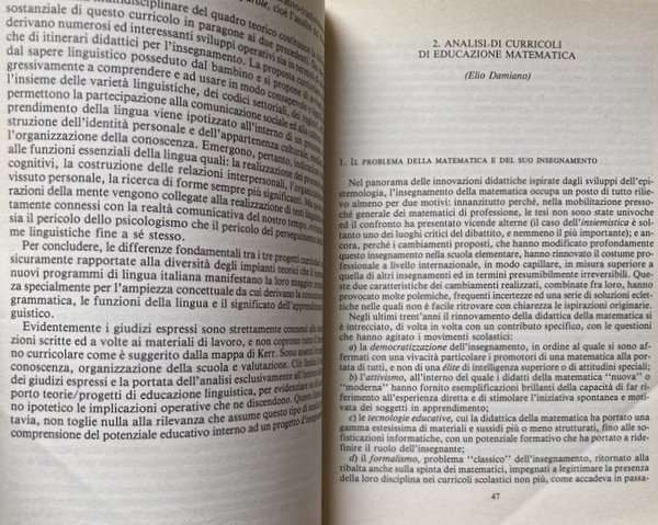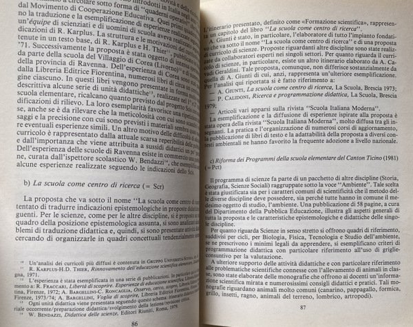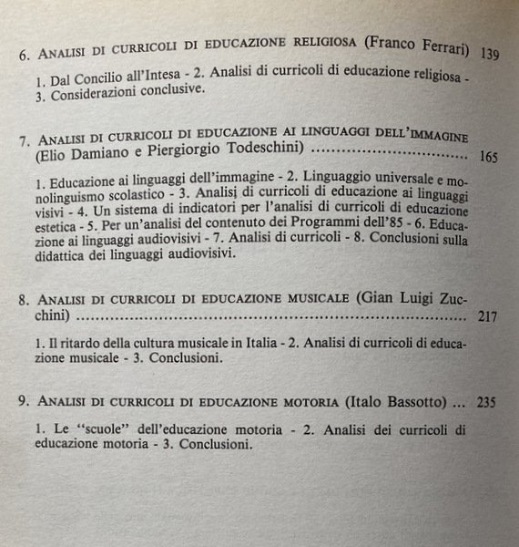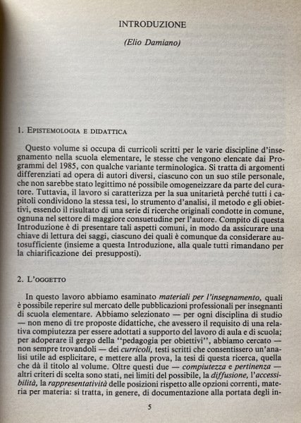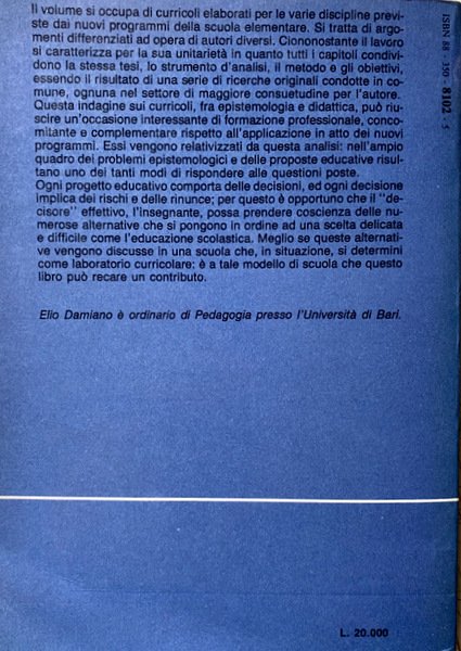 Soggetti: Pedagogia, Didattica, Epistemologia scolastica, Insegnamento, Curricolo, Istruzione, Disciplinare, Scuola primaria italiana, Scuole elementari, Materie, Bambini, Primarie, Elementare, Alfabetizzazione, Sussidi didattici, Sussidiario, Libri di testo, Matematica, Storia, Geografia, Italiano, Inglese, Scienze, Lettura, Scrittura, Grammatica, Aritmetica, Tabelline, Numeri, Calcolo, Parole, Disegno, Dettato, Curricula, Curriculum, Filosofia, Teorie pedagogiche, Anni Sessanta, Anni Settanta, Integrazione Modelli, Metodologia, Maestri, Insegnanti, Docenti, Percorso didattico, Alunni, Traguardi previsti, Educazione, Formazione, Cultura pedagogica, Novecento, John Dewey, Anni Cinquanta, Prospettiva curricolare, Stati Uniti, Europa, Studenti, Infanzia, Secondaria, Processi cognitivi e relazionali, Competenze, Valutazione, Programma nazionale, Autonomia, Orario, Relazioni, Ambiente sociale, Famiglia, Psicologia, Programmazione, Orientamento, Dirigenti scolastici, Documento ministeriale, Esecutori, Testo, Saperi, Discipline, Critica, Classe, Mastery Learning, Apprendimento per padronanza, Giochi didattici, Strumenti, Attrezzature, Laboratori, Schemi, Mappe concettuali, Integrativi, Racconti, Interviste, Tema, Partecipazione, Lezioni frontali, Autostima, Fiducia, Capacità, Logica curricolare, Lettere a una professoressa, Barbiana, Don Lorenzo Milani, Organizzazione classista, Programmi ministeriali, Decreti, De Saussure, Girardet, Zoi, Educazione storica, Ordinanze, Circolari, Contestazione, Sessantotto, Dibattito politico, Massa, Programmazione educativa, Attività integrative, Insegnamenti speciali, Medie, Obbligo, Legge 517, 4 agosto 1977, Tempo pieno, Diritto allo studio, Riforma strutturale, Sistema, Collegialità, Autogoverno, Obiettivi, The child and the curriculum, Bobbit, Unità, Bruner, Piaget, Ralph Tyler, Basic Principles of Curriculum and Instruction, Teoria Comportamentista, Comportamentismo, Watson, Skinner, Neocomportamentista, Bloomer, Gagnè, Tassonomie, Dario Antiseri, Cognitivismo, Bloom, De Block, J. P. Guilford, Affettivo, D'Hainaut, French, Krathwohl, Campo psicomotorio, Dave, Guilford, Harrow, Kibler, Simpson, Tassonomia, Complessità, Concetti, Paolo Zanelli, Andrea Canevaro, Ostacoli, Difficoltà, Conoscenze, Dissonanza cognitiva, Bianca De Bernardi, Michele Pellerey, Docimologia, Misurazione, Mario Gattullo, Franco Frabboni, Innovazione, Collegio, Scheda personale, Offerta Formativa, Storia, Pratica, Scienze umane e sociali, Antropologia culturale, Linguistica, Ricerca, H. Taba, Pedagogisti, Educatori, Cesare Scurati, Interdisciplinarietà, Esercitazioni, Compiti, Mappe, Deficit, Linguaggio, Armando, Imparare, Mediatori, Tutor, Sostegno, Jean-Jacques Rousseau, Kurt Lewin, Michel Foucault, Cognitivismo, P.G. Rossi, Houssaye, Vygotskij, Materiali, Anni Ottanta, Analisi, Tesi, Libri rari Vintage Fuori catalogo, Mappa di Kerr, Staff, Verifica, Prove, Controllo, Rete, Scr, Scis, Np, Pct, Attività, Canton Ticino, Svizzera, Giunti, Calidoni, Riferimento, Consultazione, Monografie, Animali, Figure, Cavadi Geraldini, Thier, Karplus, Annales, Febvre, Bloch, Attivismo, Formalismo, Democratizzazione, Tecnologie, Religione, Elle Ci Di, Franca Kannheiser Feliziani, Diritti, Libertà, Catechismo, Catechesi, Chiesa, Cattolicesimo, Aimc, Prioreschi, Concilio Vaticano, Musicale, Immagini, Audiovisivi, Estetica, 1985, Educazione Motoria, Ginnastica, Sport, Pedagogy, Didactics, School epistemology, Teaching, Education, Disciplinary, Italian primary Elementary schools, Subjects, Children, Primary, Elementary, Literacy, Teaching aids, Subsidiary, Textbooks, Mathematics, History, Geography, English, Science, Reading, Writing, Grammar, Arithmetic, Tables, Numbers, Calculation, Words, Drawing, Dictation, Philosophy, Pedagogical Theories, Sixties, Seventies, Integration Models, Methodology, Masters, Teachers, Educational path, Pupils, Expected goals, Education, Training, Pedagogical culture, Twentieth century, Fifties, Curricular perspective, United States, Europe, Students, Childhood, Secondary, Cognitive relational processes, Skills, Evaluation, National program, Autonomy, Timetable, Relations, Social environment, Family, Psychology, Programming, Orientation, School managers, Ministerial document, Executors, Text, Knowledge, Disciplines, Critics, Mastery learning, Didactic games, Tools, Equipment, Laboratories, Schemes, Concept maps, Integrative, Stories, Interviews, Theme, Participation, Frontal lessons, Self-esteem, Confidence, Skills, Curricular logic, Class organization, Ministerial programs, Decrees, Historical education, Ordinances, Circulars, Contestation, Sixty-eight, Political debate, Educational planning, Integrative activities, Special courses, Averages, Obligation, Full time, Right to study, Structural reform, System, Collegiality, Self-government, Objectives, Units, Theory Behaviorist, Behaviorism, Neo-behaviorist, Taxonomies, Cognitivism, Psychomotor field, Taxonomy, Complexity, Concepts, Obstacles, Difficulty, Knowledge, Cognitive dissonance, Docimology, Measurement, Innovation, College, Personal data sheet, Educational offer, History, Practice, Human social sciences, Cultural Anthropology, Linguistics, Research, Pedagogists, Educators, Interdisciplinarity, Exercises, Tasks, Maps, Language, Learn, Mediators, Support, Cognitivism, Materials, Eighties, Analysis, Thesis, Rare Books Out of Print, Verification, Control, Network, Activities, Switzerland, Reference, Consultation, Monographs, Animals, Figures, Activism, Formalism, Democratization, Technologies, Religion, Rights, Freedom, Catechism, Catechesis, Church, Catholicism, Vatican council, Musical, Images, Audiovisual, Aesthetics, Exercise education, Gymnastics