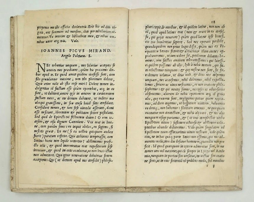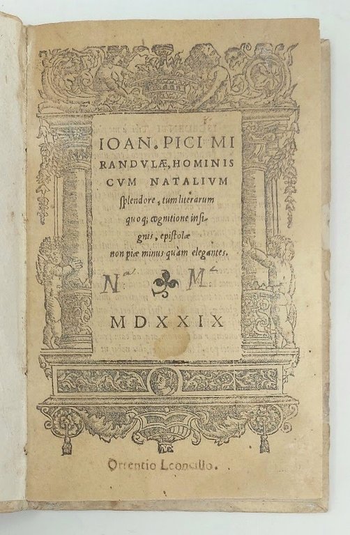 >in-8 (153x95 mm), ff. 44, legatura in pergamena floscia di riuso (tracce di scrittura). Titolo entro bordura xilografica, vignetta in fine, elegante minuscolo carattere corsivo. Edizione rara. Si tratta di quasi 50 lettere inviate alle più straordinarie personalità dell'Umanesimo di fine XV secolo: Ermolao Barbaro, Marsilio Ficino, Angelo Poliziano, Battista Guarino. Alcune sono indirizzate al nipote Gianfrancesco, ed una, assai importante, ad Aldo Manuzio: gli comunica l'invio della tanto desiderata editio princeps di Omero impressa a Firenze da Bernardo de' Nerli il 9 Dicembre 1488: "Mitto Homerum quem desiderabas serius tamen, quam et tu voluisti et ego debba"; considerato che Aldo pubblicherà la propria edizione soltanto nel 1504, dopo averlo confrontato con vari testimoni manoscritti, si tratta di un esempio rilevante della lentezza dei progetti editoriali dell'epoca. "Tu, quod tu scribis facturum, accingere ad philosophiam, sed hac lege, ut memineris nullam esse philosophiam quae a mysterionim veritate nos avocet. Philosophia veritatem quaerit theologia invenit, religio possidet", lo consola in fine delle difficoltà: "La filosofia cerca la verità, la teologia la trova, la fede la possiede". Quando Pico si trasferì a Firenze, procurò a Manuzio il posto di tutore dei suoi due nipoti Lionello Pio e Alberto III Pio, principi di Carpi; quest'ultimo divenne poi il finanziatore delle prime stampe di Aldo. Esemplare genuino, frontespizio brunito, alone d'umido all'angolo inf. esterno, nota di possesso ms. nel margine inferiore del titolo e del colophon (Ottentio Leoncillo), ed altra all'occhietto "ex libris Nicolai Maroti... Da Alessandro Lucantonio"