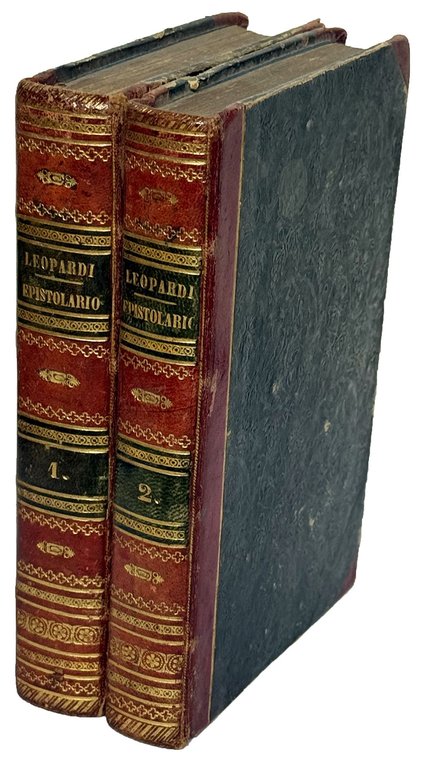 Prima edizione, pubblicata postuma, dell'epistolario leopardiano che raccoglie: il discorso del prof. Viani ai conti Carlo, Paolina e Pierfrancesco Leopardi; 546 lettere di Leopardi, le iscrizioni triopee, 98 lettere di Pietro Giordani e 6 di Pietro Colletta.
