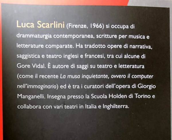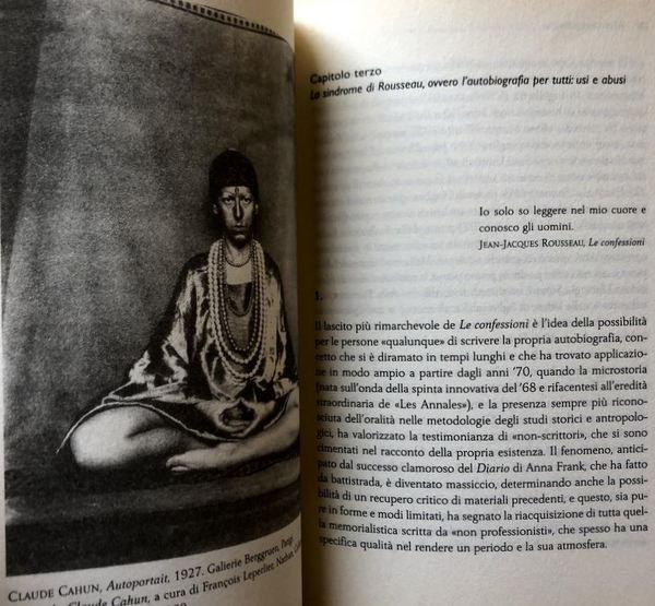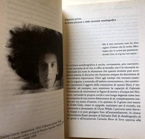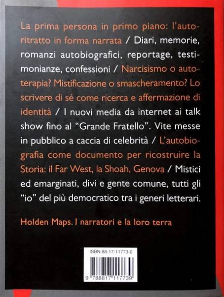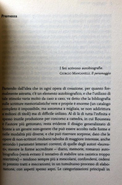 Soggetti: Scrittura, Autobiografie, Biografie, Letteratura comparata, Critica letteraria, Saggi, Scrivere, Sé, Esercizi, Stile, Narrazione, Racconti autobiografici, Giorgio Manganelli, Autori, Scrittori illustri, Vita, Memorie, Diario, Memorialistica, Pratica, Generi letterari, André Gide, Oscar Wilde, Gabriele D'Annunzio, Didattica, Drammaturgia, Miti, Problemi, Identità, Storie, Narrare, Sindrome di Rousseau, Fatti, Bibliografia, Biblioteca, Libri Vintage, Fuori catalogo, Confessioni, Anna Frank, Claude Cahun, Autoritratti, Mistificazione, Maschere, Bulgakov, Molière, Brasillach, André Chénier, Gore Vidal, Attualità, Resoconti, Viaggio, Testimonianze, Esperienze, Reportage, Olocausto, Shoah, Storia, James Olney, Elias Canetti, Benjamin Franklin, Dolores Prato, Fosco Maraini, Ryszard Kapuszinski, Arbasino, Edith Sitwell, Clemente Rebora, C.S. Lewis, Ferdinando Tartaglia, Sacro, Biografi illustri, Reality shows, Je est un autre, Rimbaud, Leiris, Perec, Storytellers, Writing, Autobiographies, Biographies, Comparative Literature, Literary Criticism, Essays, Writing, Self, Exercises, Style, Narration, Autobiographical Stories, Authors, Illustrious Writers, Life, Memories, Diary, Memorial, Practice, Literary Genres, Didactics, Dramaturgy, Myths, Problems, Identity, Stories, Narrating, Facts, Bibliography, Library, Out of print Books, Confessions, Self-Portraits, Mystifying, Masks, Current Affairs, Reports, Travel, Testimonials, Experiences, Holocaust, History, Sacred, Illustrious Biographers