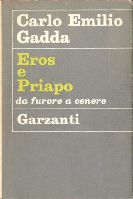 3. ed. 212 p. ; 20 x 13 cm. Dice Gadda che "Il Bombetta" prese il potere perché era un esibizionista, e l'esibizionismo affascina chiunque coltivi una vocazione latente per l'appunto esibizionistica. Basta sostituire "Bombetta" con il nome di Mussolini per avere chiaro il contenuto di questo anti-romanzo: riflessione storica sul fascismo, pamphlet feroce ed esilarante, saggio sulla sociologia e la fisiologia che ha permesso vent'anni di dittatura, ma ricco di aneddoti ed episodi narrativi. Pubblicato solo nel 1967, il libello affonda le radici negli anni fiorentini, tra il '44 e il '45: è alla rabbia e alla disperazione di quel periodo che "Eros e Priapo" deve il tono di esasperata polemica che lo caratterizza e che si esprime in un ribollire di parole e immagini, a stento contenute nei moduli del trattato machiavelliano e di una prosa arcaicheggiante di tipo toscano-cinquecentesco. Una durissima condanna nei confronti della follia che ha portato l'Italia alla rovina, un atto d'accusa contro la stupidità umana elevata a sistema di governo. Legatura editoriale, coperta rigida in tela rossa, titolo impresso in oro al dorso, muto il piatto, sovraccoperta illustrata a colori con alette. Codice libreria 1240.