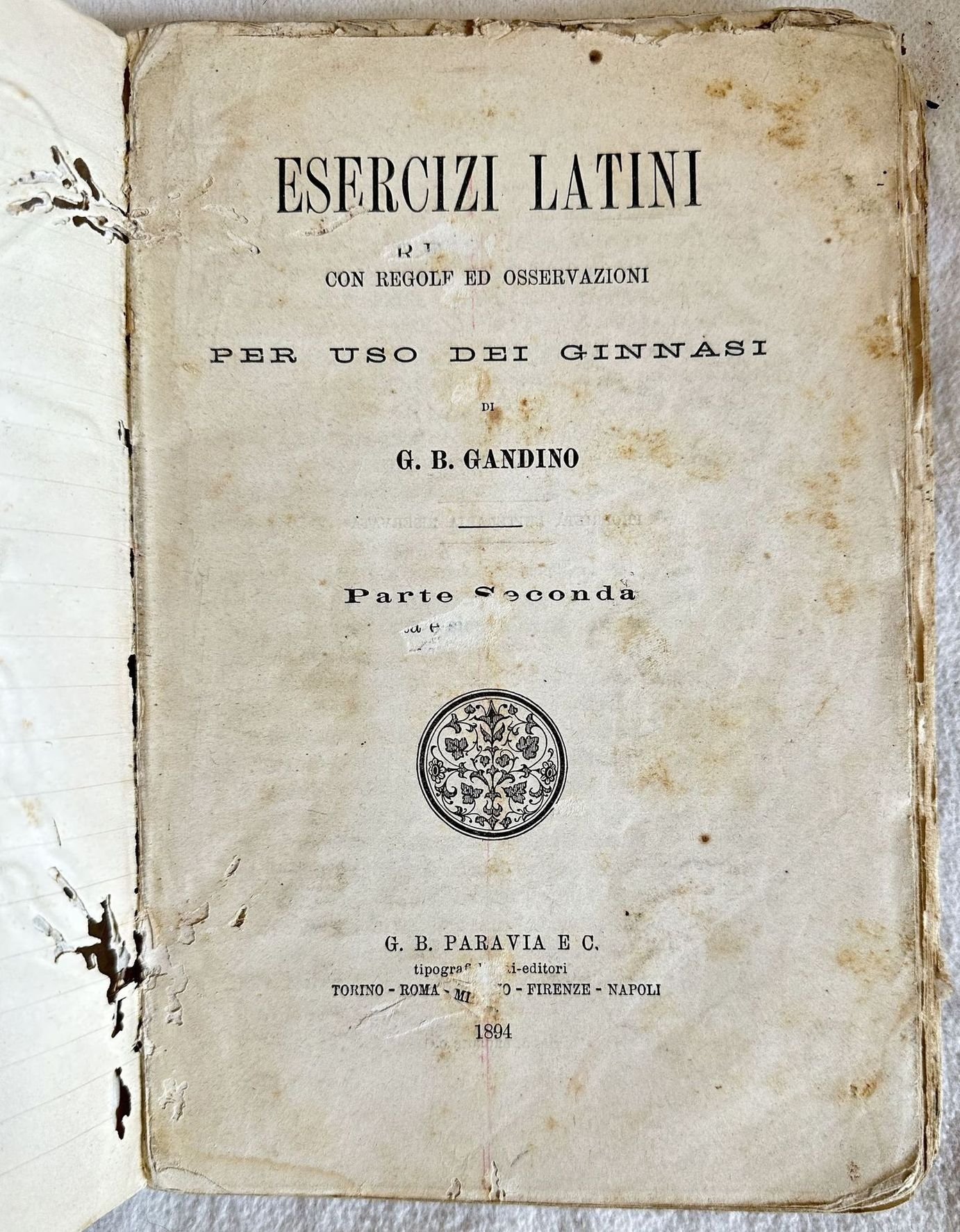 Edizione del 1894 di questo volume di esercizi latini con regole e ossservazioni a cura di G. B. Gandino. Siamo in possesso della parte seconda per uso dei ginnasi. Testo in italiano e latino. In buone condizioni. Copertina morbida in discrete condizioni con usure marginali. Legatura in mediocri condizioni con rotture. All'interno le pagine si presentano in buone condizioni con fioriture. In 8. Dim. 21x14,5 cm. Pp. VIII+172. Edition of 1894 of this volume of latin exercises with rules and observations by con regole e ossservazioni a cura di G. B. Gandino. We only have the second part for high school In good conditions. Editorial cover in fair conditions lightly worn in the extremities. Binding in poor conditions with cracks. Pages in good conditions with foxing. In 8. Dim. 21x14,5 cm. Pp. VIII+172.