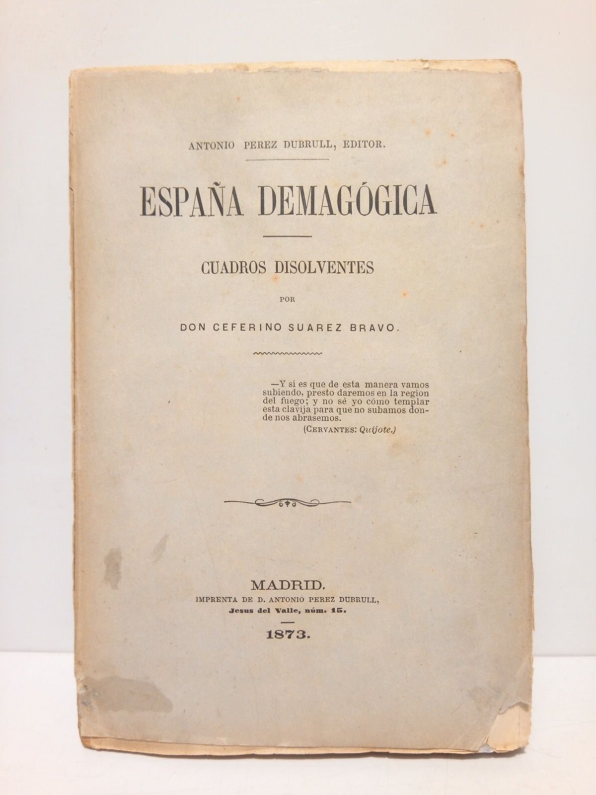 PRIMERA EDICION.- Madrid: Antonio Perez Dubrull, Ed., 1873.- 168 p.; 8º (18,7 x 12,4 cm); Intonso; Rústica Ed.- Curioso libro que refleja una España que en el fondo no ha cambiado en nada.* La cubierta anterior está falta de un pequeño trozo en su esquina inferior, y una mínima restauracuón en el mismo lugar de las dos hojas siguientes. Pequeña reparación al pie del lomo. Por lo demás en perfecto estado. POLÍTICA ESPAÑOLA DESDE 1833 A 1936