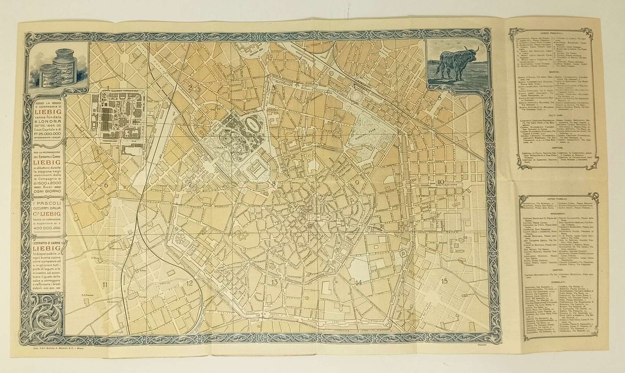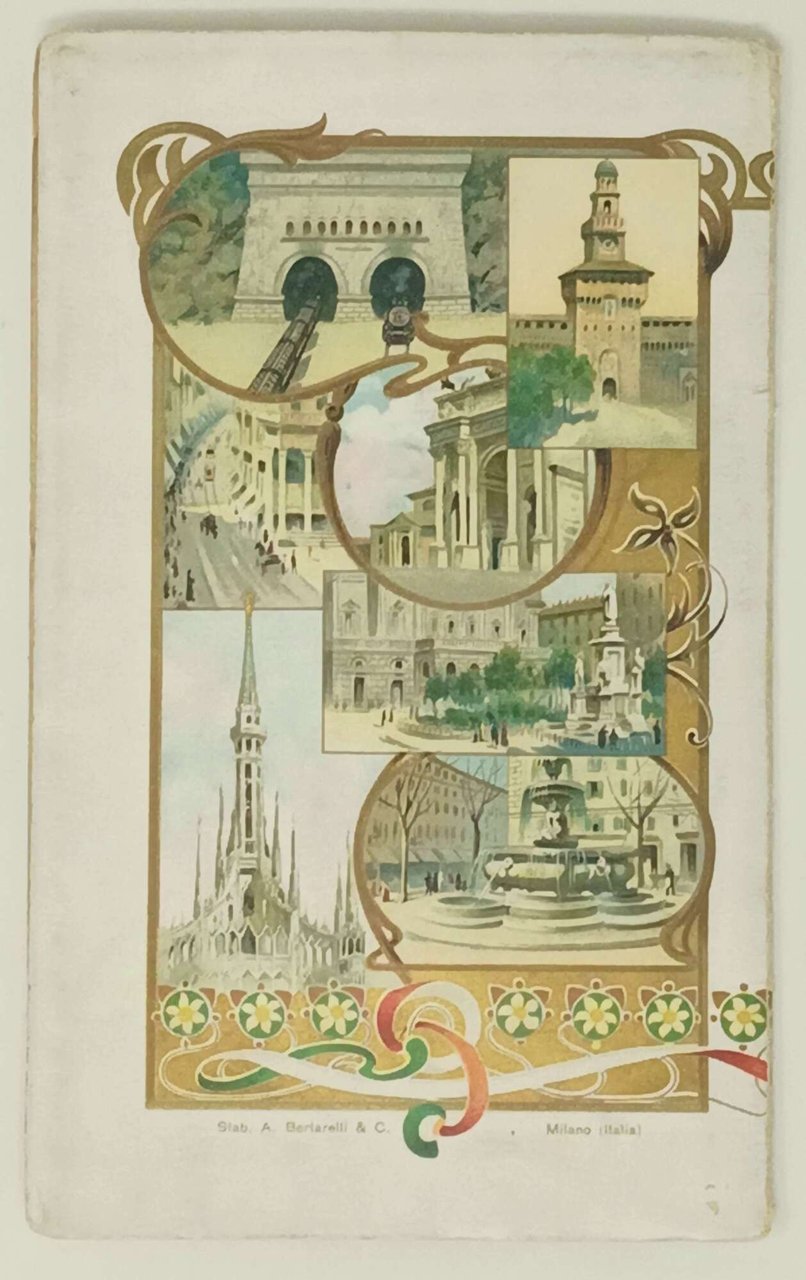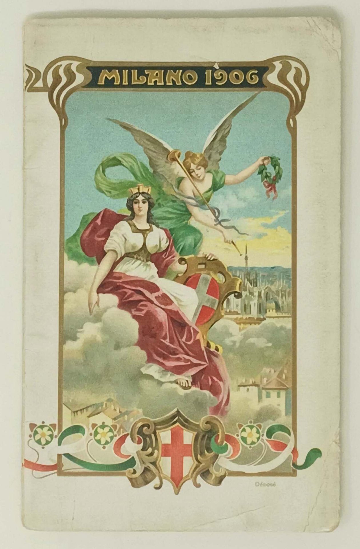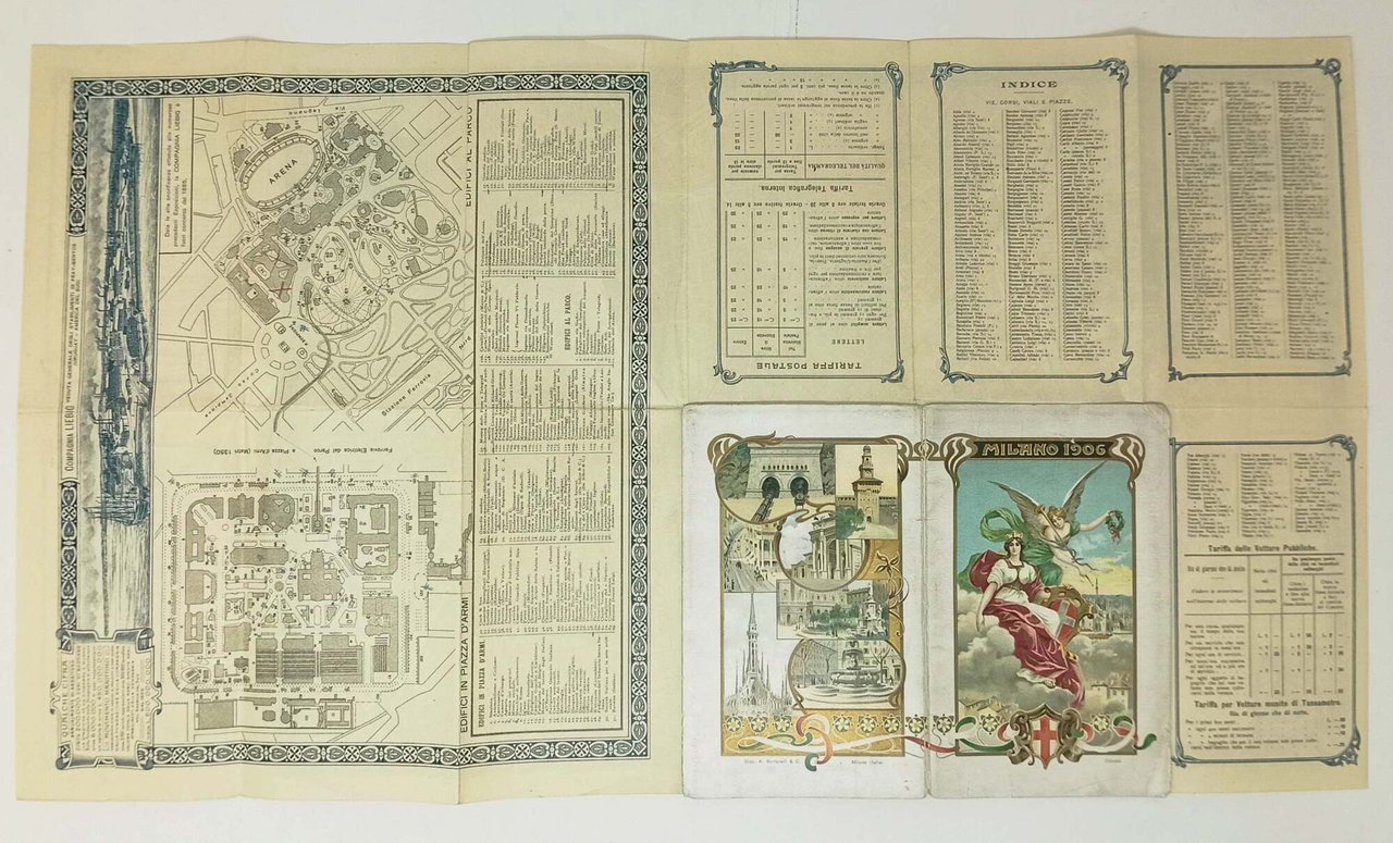 >Mappa del Parco Sempione (mm 175x110), realizzato in occasione dell'Esposizione Universale tenutasi a Milano nel 1906, con indice delle strade e degli edifici in Piazza d'Armi e al Parco. Indicazioni di musei, teatri, monumenti e altre informazioni utili. La mappa è ripiegata più volte conservata entro una bella ed elegante brossura editoriale cromolitografica con stemma di Milano al recto ed alcuni scorci della città al verso. Curiosità: la mappa e le legende sono inserite in cornici decorative, in stile Déco, con pubblicità del brodo Liebig, che, "Date le alte onorificenze ottenute alle numerose precedenti Esposizioni (...) è fuori concorso dal 1885". Alcuni segni di possesso, come a segnare i luoghi visitati. Ben conservata.