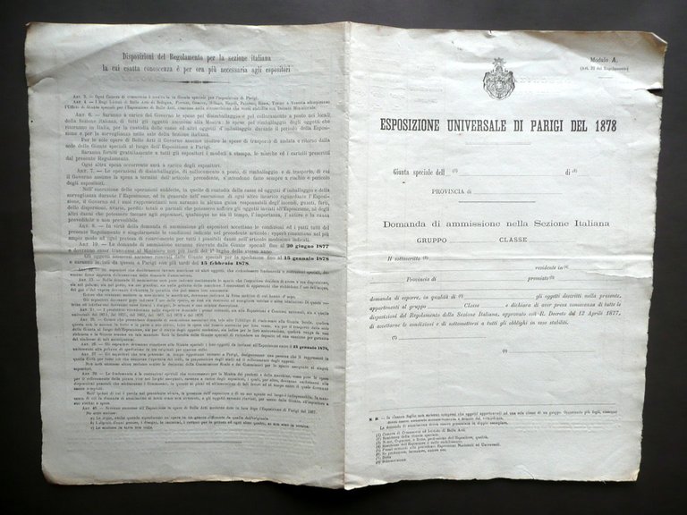 Esposizione Universale di Parigi 1878 Modulo Ammissione nella Sezione Italiana