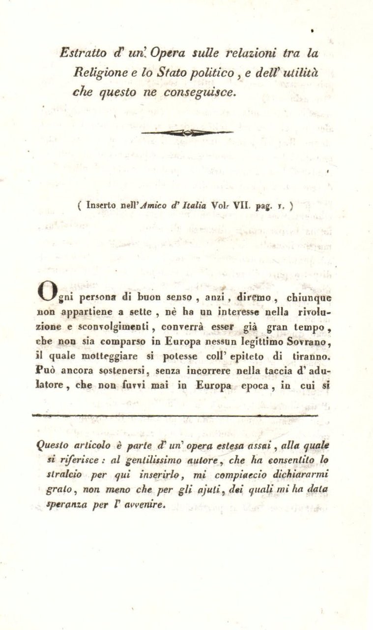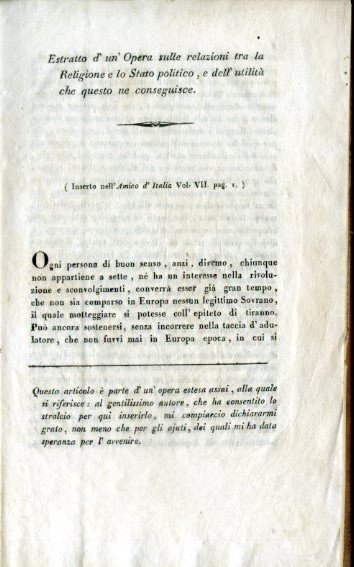 Estratto d'un Opera sulle relazioni tra la Religione e lo Stato politico, e dell'utilità che questo ne conseguisce (Inserto nell'Amico d'Italia, vol. VII, pag. 1)