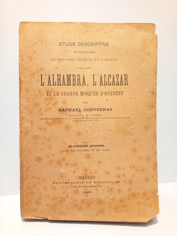 4eme. Ed.- Madrid: Typ. de Ricardo Fe, 1889.- 462 p.: ilustraciones y un plano plegado de la Alhambra de Granada; 8º mayor (19,5 x 13,8 cm); Texto en francés; Rústica Ed.* Las cubiertas algo moteadas de óxido. Papel ligeramente tostado. Por lo demás en muy buen estado. CULTURA ARÁBIGO-ESPAÑOLA