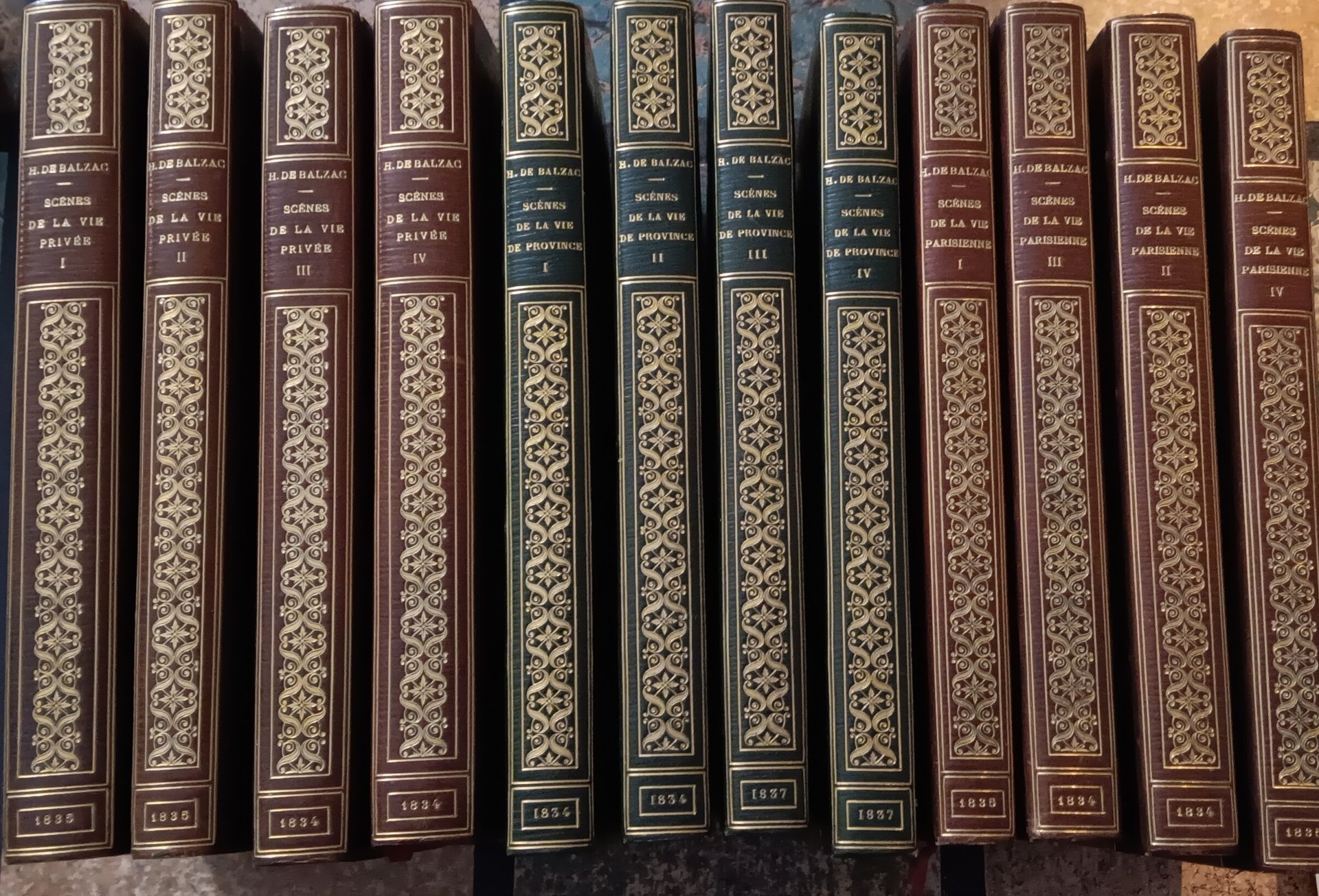 Etudes des moeurs au XIXe siècle. Par M. De Balzac.Tome I. Première série. Scènes de la vie privée. 1er volume. In-8°, (2cc), 401pp, (1c)Paris, Madame Charles-Béchet et Legrand et Bergounioux, 1835. Tome II, Etudes des moeurs au XIXe siècle. Par M. De Balzac. Tome II. Première série. Scènes de la vie privée. IIe volume. Paris, Madame Charles-Béchet, 1835. In-8°, (4cc), 361pp, (3cc), (2cc)Tome III, Etudes des moeurs au XIXe siècle. Par M. De Balzac. Tome III. Première série. Scènes de la vie privée. 3e volume. Paris, Werdet, 1838. In-8°, (4cc), 386pp, (1c)Tome IV, Etudes des moeurs au XIXe siècle. Par M. De Balzac. Tome IV. Première série. Scènes de la vie privée. 4e volume. Paris, Madame Charles-Béchet 1834. In-8°, (4cc), 398pp, (1c), (8cc)*Tomo V, Etudes des moeurs au XIXe siècle. Par M. De Balzac. Tome V. Deuxième série. Scènes de la vie de province. 1er volume. Paris, Madame Charles-Béchet 1834. In-8°, (4cc), 384pp, (1c)Tomo VI, Etudes des moeurs au XIXe siècle. Par M. De Balzac. Tome VI. Deuxième série. Scènes de la vie de province. 2e volume. Paris, Madame Charles-Béchet 1834. In-8°, (2cc), 388pp, (1c).Tomo VII, Etudes des moeurs au XIXe siècle. Par M. De Balzac. Tome VII. Seconde série. Scènes de la vie de province. 3e volume. Paris, Werdet, 1837. In-8°, (2cc), 359, ucbTomo VIII, Etudes des moeurs au XIXe siècle. Par M. De Balzac. Tome VIII. Seconde série. Scènes de la vie de province. 4e volume. Paris, Werdet, 1837. In-8°, (2cc), XII, (2cc), 358pp, (1c)*Tomo IX, Etudes des moeurs au XIXe siècle. Par M. De Balzac. Tome IX. Troisième série. Scènes de la vie parisienne. 1er volume. Paris, Madame Charles Béchet et Legrand et Bergounioux, 1835. In-8°, (6cc), 340ppTomo X, Etudes des moeurs au XIXe siècle. Par M. De Balzac. Tome X. Troisième série. Scènes de la vie parisienne. 2e volume. Paris, Madame Charles Béchet et Legrand et Bergounioux, 1834. In-8°, (2cc), 366pp, (1c)Tome XI, Etudes des moeurs au XIXe siècle. Par M. De Balzac. Tome XI. Troisième série. Scènes de la vie parisienne. 3e volume. Paris, Madame Charles Béchet et Legrand et Bergounioux, 1834. In-8°, (4cc), 349pp, (1c)Tome XII, Etudes des moeurs au XIXe siècle. Par M. De Balzac. Tome XII. Troisième série. Scènes de la vie parisienne. 4e volume. Paris, Madame Charles Béchet et Legrand et Bergounioux, 1835. In-8°, (4cc), 390pp, (1cc)Legature in mezzo marocchino verde con angoli di Mercier. Dorso con fregi in oro e titolo in oro al dorso. I dorsi dei tomi della prima e terza serie sono scoloriti in marrone chiaro. Esemplari in barbe in carta vergellata molto fresca e inchiostratura brillante. Ex libris André Langlois sul contropiatto del primo tomo di ciascuna serie. Conservate tutte le copertine e i dorsi originali.Green half morocco bindings with corners by Mercier. Gilt title and friezes on the spine. The spines of the volumes of the first and third series are discolored in light brown. Deckled edges on wove fresh paper, brilliant ink. Ex libris André Langlois on the back of the front cover of the first volume of each series. Original covers and spines are kept.