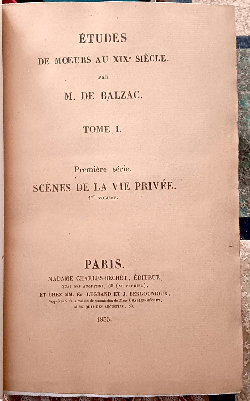Etudes des moeurs au XIXe siècle. Par M. De Balzac.Tome I. Première série. Scènes de la vie privée. 1er volume. In-8°, (2cc), 401pp, (1c)Paris, Madame Charles-Béchet et Legrand et Bergounioux, 1835. Tome II, Etudes des moeurs au XIXe siècle. Par M. De Balzac. Tome II. Première série. Scènes de la vie privée. IIe volume. Paris, Madame Charles-Béchet, 1835. In-8°, (4cc), 361pp, (3cc), (2cc)Tome III, Etudes des moeurs au XIXe siècle. Par M. De Balzac. Tome III. Première série. Scènes de la vie privée. 3e volume. Paris, Werdet, 1838. In-8°, (4cc), 386pp, (1c)Tome IV, Etudes des moeurs au XIXe siècle. Par M. De Balzac. Tome IV. Première série. Scènes de la vie privée. 4e volume. Paris, Madame Charles-Béchet 1834. In-8°, (4cc), 398pp,
