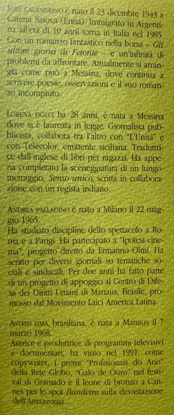 Calandrino Josè. È nato il 23 dicembre 1943 a Catena nuova (Enna). Immigrato in Argentina all'età di dieci anni torna in Italia nel 1985. Con un romanzo fantastico nella borsa "Gli ultimi giorni di Fetonte" e un’infinità di problemi da affrontare.