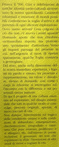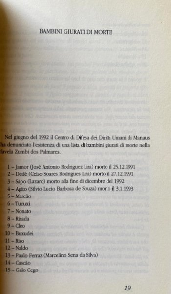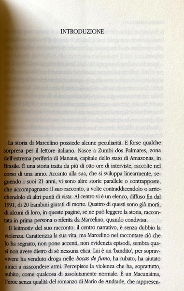 Soggetti: Scienze sociali, Sociologia, Droga, Sicilia, Violenza sui minori, Infanzia abbandonata, Bambini, Messina, Prostituzione infantile, Diritti del bambino, Brasile, Cultura, Meninos das ruas, Ragazzi di strada, Delinquenza giovanile, Clan, Violenza, Sfruttamento minorile, Gruppi sociali, Miseria, Povertà, Storie vere, Narrativa, letteratura, Biografie, Racconti, Brasiliani, Siciliani, Manaus, Periferie urbane, Megalopoli, Metropoli, Giurati di morte, Macunaima, Macunaíma, Bocas de fumo, Mario de Andrade, Adolescenza, Storie parallele, Quaderni, Bambine, Diari, America latina, Libri Vintage Fuori catalogo, Zumbi dos Palmares, Diritti umani, Favelas, Delegacias, Fame, Famiglia, Polizia militare, Colla, Cocaina, Emarginazione, Morte, Viaggio, Armi, Servizi sociali, Criminologia, Sniffare, Social sciences, Sociology, Drugs, Sicily, Violence against minors, Abandoned childhood, Children, Child prostitution, Child rights, Brazil, Culture, Street children, Juvenile delinquency, Violence, Child exploitation, Social groups, Misery, Poverty, True stories, Fiction, literature, Biographies, Tales, Brazilians, Sicilians, Urban suburbs, Megalopolis, Metropolis, Death sworn, Adolescence, Parallel stories, Notebooks, Girls, Diaries, Out of print books, Human rights, Hunger, Family, Military police, Cocaine, Marginalization, Death, Travel, Weapons, Social Services, Criminology, Sniffing