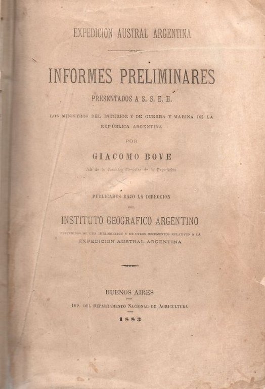Expedición Austral Argentina. Informes preliminares presentados a S.S. E.E. los Ministros del Interior y de Guerra y Marina de la República Argentina por Giacomo Bove, Jefe de la Comisión Científica de la Expedición. Publicados bajo la dirección del Instituto Geográfico Argentino. Precedidos de una Introducción y de otros documentos relativos a la Expedición Austral Argentina.