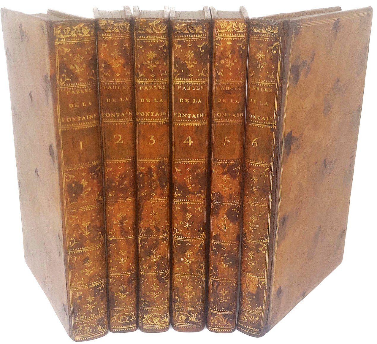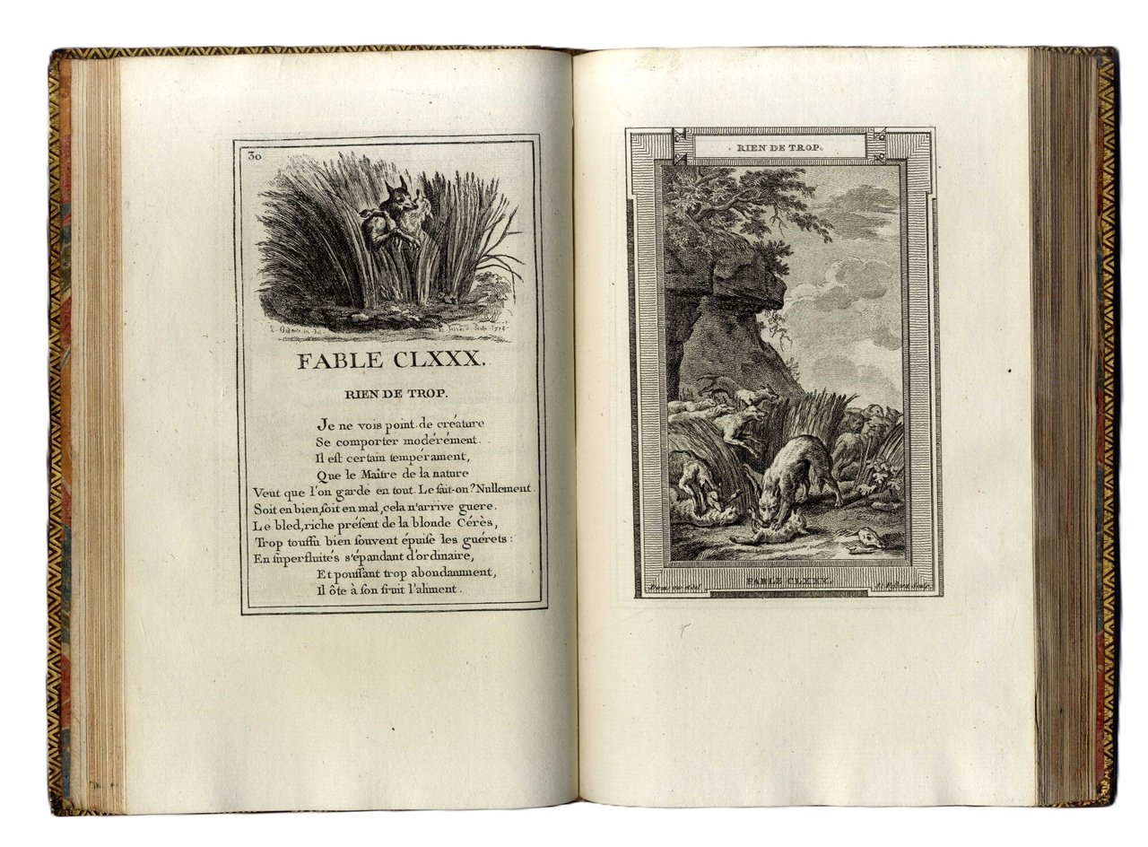 >6 volumi in-8 (202x125 mm), pp (4), LXXI, (1), 100; VI, 102; IV, 95, (1); (6), 134; (4), 103; (4), 115. Bella legatura coeva piena pelle marmorizzata, triplice filettatura oro ai piatti, dorsi lisci finemente ornati in oro ai piccoli ferri, duplici tasselli per i titoli, tagli dorati, dentelles interne. Bellissima edizione con le tavole ed il testo interamente incisi in rame. Capolavoro dei figurati francesi del settecento. Prima tiratura, illustrata da un antiporta (nel I volume), 6 titoli figurati, 243 illustrazioni a piena pagina, 243 vignette e 226 finalini; in totale 723 illustrazioni incise da Etienne Fressard da disegni di Monnet, Bardin, Bidault, Caresme, Meyer, Leprince e altri. Testo inciso da Montulay e Drouet. Esemplare fresco, marginoso, in perfetto stato di conservazione, al contropiatto di ciascun volume è presente l'ex-libris “Henri Lambert, Versaille”, sulla sguardia del primo volume ex libris ms “Camus Daras”. Cohen-Ricci 551-552. Ray 61: "the ensemble is as harmonious as it is elegant". Sander 1068. Tchemerzine VI, 392.