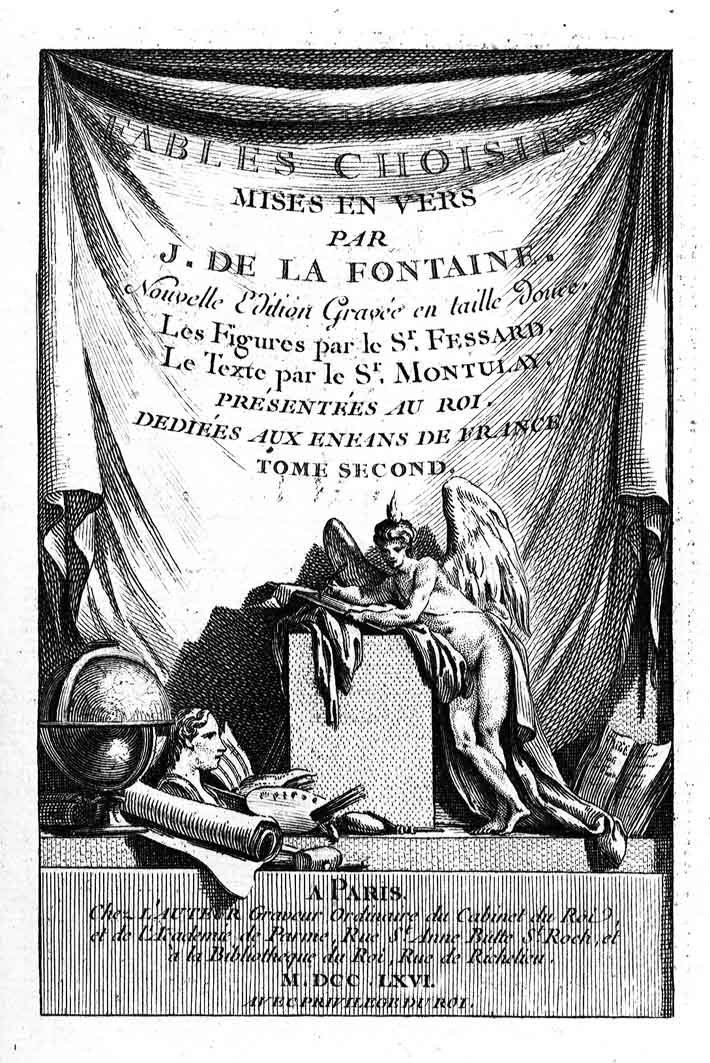 Fables choisies mises en vers. Nouvelle édition gravée en taille-douce, les figures par Fessard, le texte par Montulay. Présentées au Roy. Dédiées aux enfants de France.