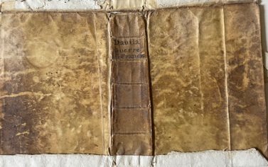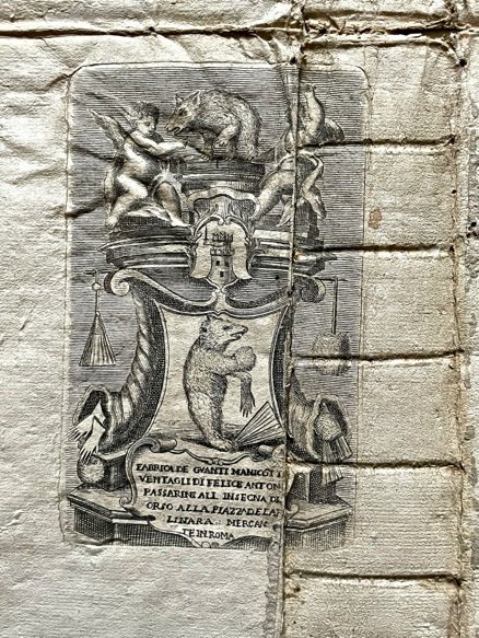 Prezioso foglio pubblicitario del 600/700 usato come fodera di una legatura in pergamena del libro: Davila, Guerre di Francia. Axs