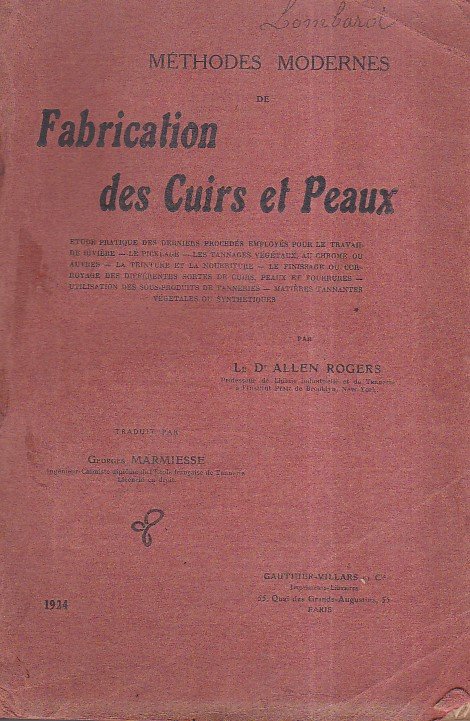 Fabrication des Cuirs et Peaux. Etude pratique des derniers procédés employés pour le travail de rivière - le picklage - les tannages végétaux, au chrome ou autres - la teinture et la nourriture - le finissage ou corroyage des différentes sortes de cuir, peaux et fourrures - utilisation des sous produits de tanneries - matières tannantes végétales ou synthétiques. Traduit par Georges Marmiesse | Libros antiguos y modernos | Rogers Allen