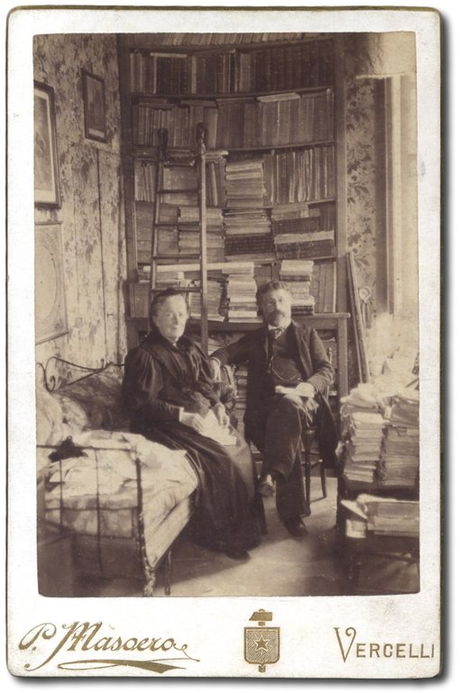 >Fotografia all'albumina cm 11x16,5 firmata P. Masoero, Vercelli non datata ma fine XIX secolo. Bella fotografia che ritrae lo scrittore nel suo studio insieme alla madre. Fa da scenario un'altissima parete di libri. Giovanni Faldella (1846-1928) è stato uno scrittore, giornalista e politico italiano.