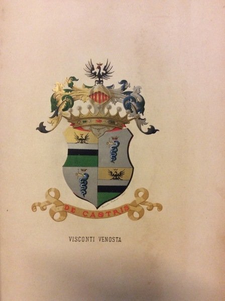 In folio (mm. 385x290), 4 volumi, mz. pelle coeva (abras. alle cerniere), decoraz. e titolo oro al dorso, ca. 300 pp. cad. vol. Descrizione di 52 famiglie nobili milanesi di cui vengono dati brevi cenni storici e tavole genealogiche. Questa importante opera è illustrata da: 32 bellissime tavole - protette da velina - litografate a colori che riproducono gli stemmi di varie famiglie; 1 pregevole tav. a colori e oro con i ritratti di Giovanni Melzi e della moglie Brigida de' Tanzi; 8 tavole litografate in tinta che raffigurano monumenti, ritratti, ecc., oltre a 320 tavole genealogiche con numerosiss. stemmi in bianco e nero "Edizione originale".Cfr. Cat. Hoepli,498 - Cat. Famiglia Meneghina,1191: "Opera fondamentale continuata, per gli ultimi due volumi, dal solo Calvi". Il ns. esemplare presenta alcune postille a matita; picc. manc. al margine infer. della tav. 10 della famiglia Cusani e alc. lieviss. ingialliture, altrimenti ben conservato.