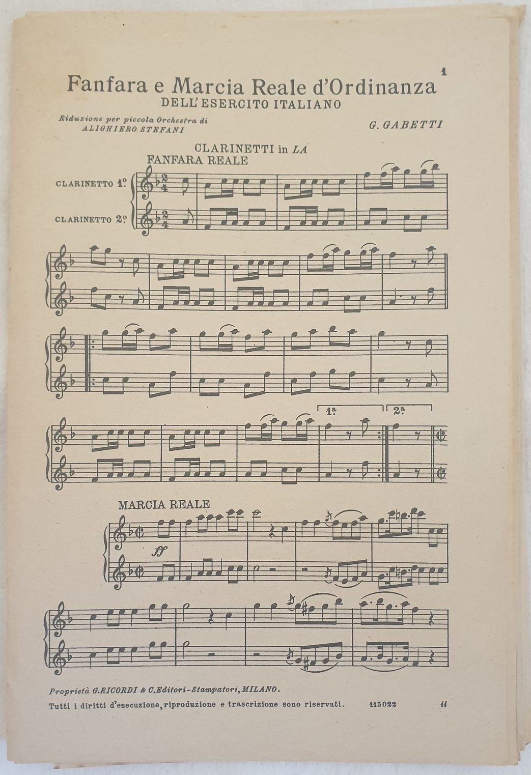 Partitura per orchestra degli anni '30 della melodia "Fanfara e marcia reale d'ordinanza dell'esercito italiano" di G. Gabetti. Copertina assente. GENERE: One step STRUMENTI: pianoforte, violino, violoncello, viola, trombone, contrabasso, corni, clarinetto, flauto, tamburo ANNO: anni '30 DIMENSIONI: In 8. cm 27x18 PAGINE: pp. 33 CONDIZIONI: Discrete condizioni. Piatto posteriore assente. Ex libris in copertinaComplete score for orchestra of 1930's of the melody "La sghiarola" by Garbolino and Fusco. Editorial soft cover. MUSIC: One step STRUMENTI: piano, violin, violoncello, violon, trombone, contrabass, horns, clarinet, flute, drums<BR>YEAR: 1930's SIZE: In 8. cm 27x18 PAGES: pp. 33 CONDITIONS: Fair conditions. Back plate lacks. Ex libris in the cover