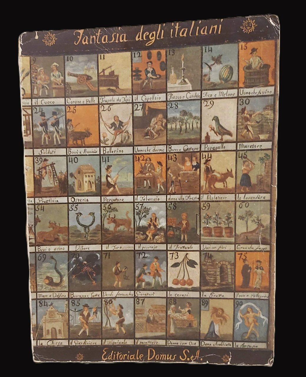in folio, pp. (72), 13, 156 (tavv.), bross. edit. con bella cop. fig. a colori raff. le 90 figure del lotto. Numerose belle pag. di pubblicità a colori cui segue il testo e le tavv., anche a colori, tra cui su fogli in cartoncino pesante sono riportate le figure di Giovan Battista Bracelli delle prima metà del XVII sec. ("Bizzarrie di varie figure"). Numero speciale della celeberrima rivista "Domus", tirato in soli 150 esempl., e dedicato al genio e alla fantasia italiana, soprattutto nelle sue espressioni artistiche. Le tavole raffigurano esempi di astrologia, zodiaco, maschere, costumi, calligrafia, macchine, pittura metafisica, capricci e trionfi, attingendo per lo più all'iconografia italiana di Depero, De Chirico, Arcimboldo, Cosmè Tura, e altri. Originario di Taranto (1905-1994) Carrieri fu scrittore e poeta. Bel volume nella veste editoriale originale e in ottime condizioni. Raro. [122]