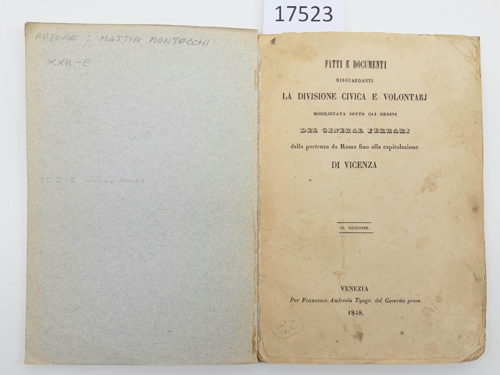 Fatti e documenti risguardanti la divisione civica e volontarj mobilizzata sotto gli ordini del Generale Ferrari dalla partenza da Roma fino alla capitolazione di Vicenza 2∞ edizione Venezia Andreola 1848