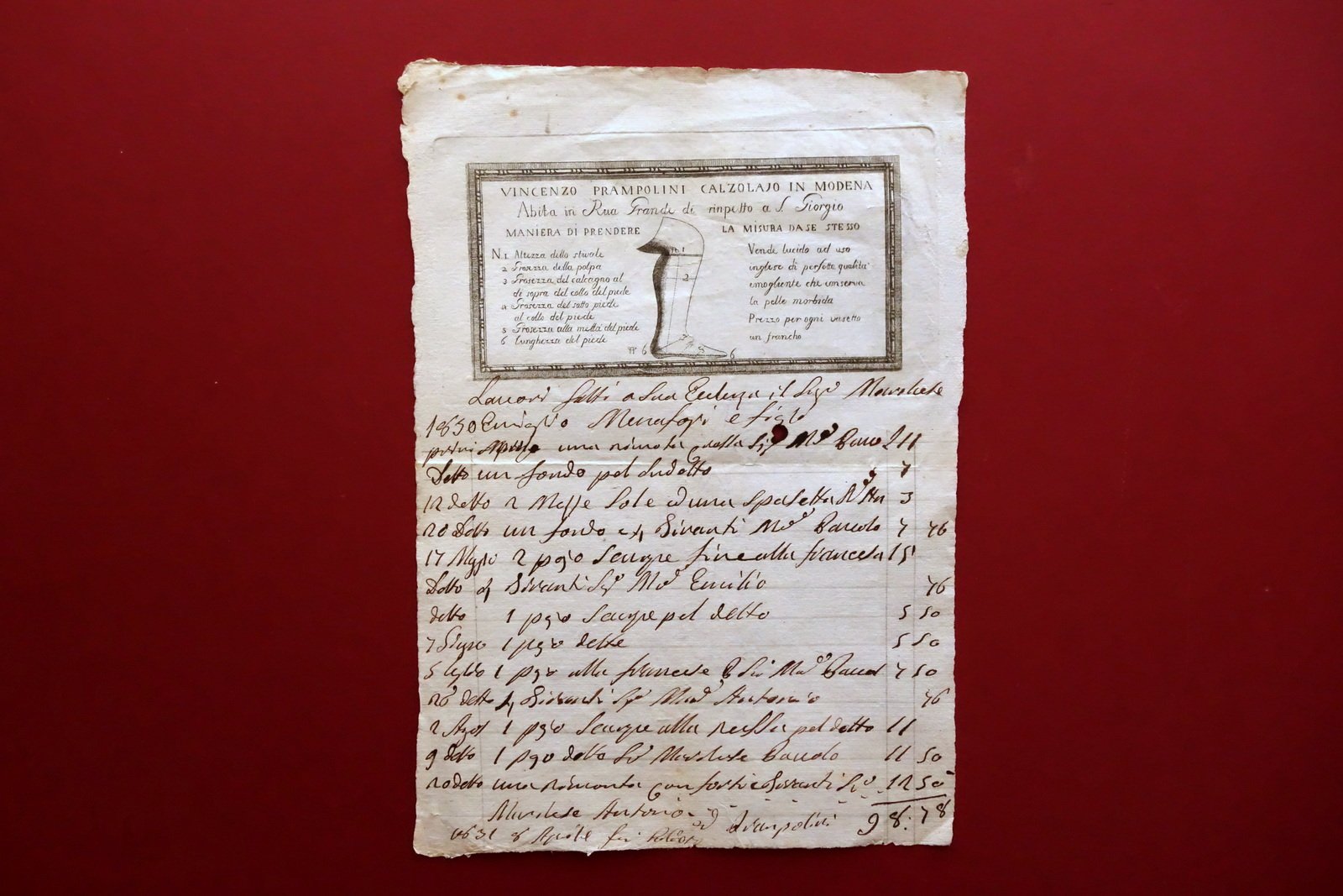 Fattura Antica Vincenzo Prampolini Calzolaio in Modena Rua Grande Incisione 1830