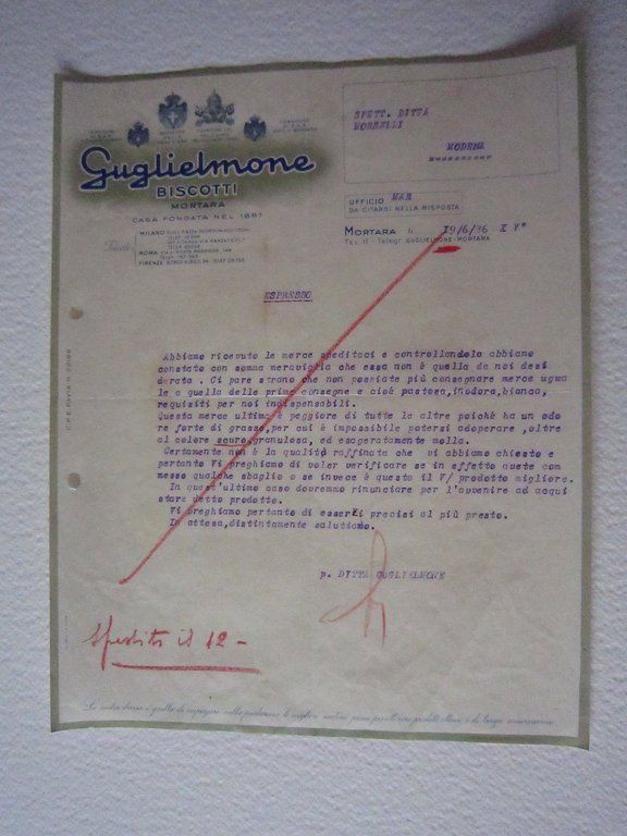Fattura Guglielmone Biscotti Mortara Milano Roma Firenze Alimenti 1936