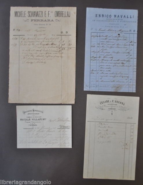 Vedere la descrizione dettagliata 4 Fatture Cesare Ancona mercerie Michelle Schiavazzi ombrellaj Natale Villani bottiglieria drogheria Enrico Ravalli orologeria Ferrara Fatture con intestazioni a stampa e compilazione a mano, tutte di Ferrara e della seconda metà del 1800. Dimensioni varie: la più grande 24,5x17 cm, la più piccola 10,5x14 cm. Condizioni di conservazione. Fatture in buono stato di conservazione con minimi segni d'uso e del tempo. Tracce di pieghe di conservazione. Minimi danni ai margini. Rare fatture ferraresi. In blocco. Per libri e documenti su questo e altri argomenti visitate il nostro negozio Libreria Grandangolo" Data l'importanza delle 5 stelle rilasciate durante l'assegnazione del feedback, invitiamo tutti gli acquirenti, se soddisfatti del loro acquisto, a rilasciare tutte le 5 stelle. La mancanza anche solo di una stella illuminata è molto lesiva per noi venditori professionali. Grazie! CONDIZIONI DI VENDITA Spedizione Fino a 5 kg piego di libri raccomandato, oltre i 5 kg pacco postale. Si ricorda che l'imballo viene eseguito con la massima cura. La merce viene spedita a pagamento avvenuto e viaggia a rischio e pericolo dell'acquirente. Per maggiori informazioni vedi la pagina SPEDIZIONI del nostro negozio. Ritiro diretto Siamo disponibili per il ritiro diretto a Modena e a Milano. Per gli indirizzi delle sedi vedi la pagina DOVE SIAMO del nostro negozio. Acquisti multipli Se si acquistano più libri, la spedizione si paga una sola volta, purché si rispettino gli scaglioni di peso. Estero / Foreign For international shipment, please contact us. Metodo di pagamento Pay Pal, bonifico bancario, versamento postale (cc/p, vaglia o altro). La spedizione avverrà entro i primi 4 giorni lavorativi dopo la conferma di avvenuto pagamento. Si emette ricevuta fiscale e a richiesta fattura. Il pagamento deve essere effettuato entro 7 giorni lavorativi dalla data di acquisto, trascorsi i quali l'oggetto sarà rimesso in vendita. Feedback Viene rilasciato dall'acquirente dopo il ricevimento di quanto acquistato. Data la sua importanza, vi invitiamo a leggere il breve testo della pagina FEEDBACK del nostro negozio. Pertanto, in caso di qualsiasi problema, non esitate a contattarci. Diritto di recesso L'acquirente ha il diritto di restituire l'oggetto entro 14 giorni ed essere rimborsato, escluse le spese di porto e imballo. L'oggetto deve essere restituito, dopo previa comunicazione, imballato e nelle medesime condizioni di come era all'origine. Creato da Turbo Lister Strumento gratuito per mettere in vendita i tuoi oggetti. Metti in vendita i tuoi oggetti in modo facile e veloce e gestisci le inserzioni in corso. "
