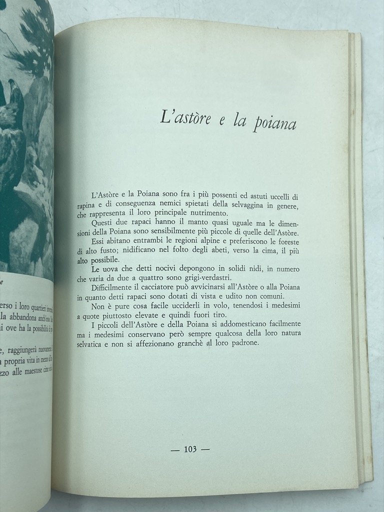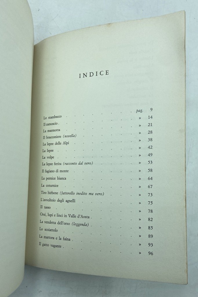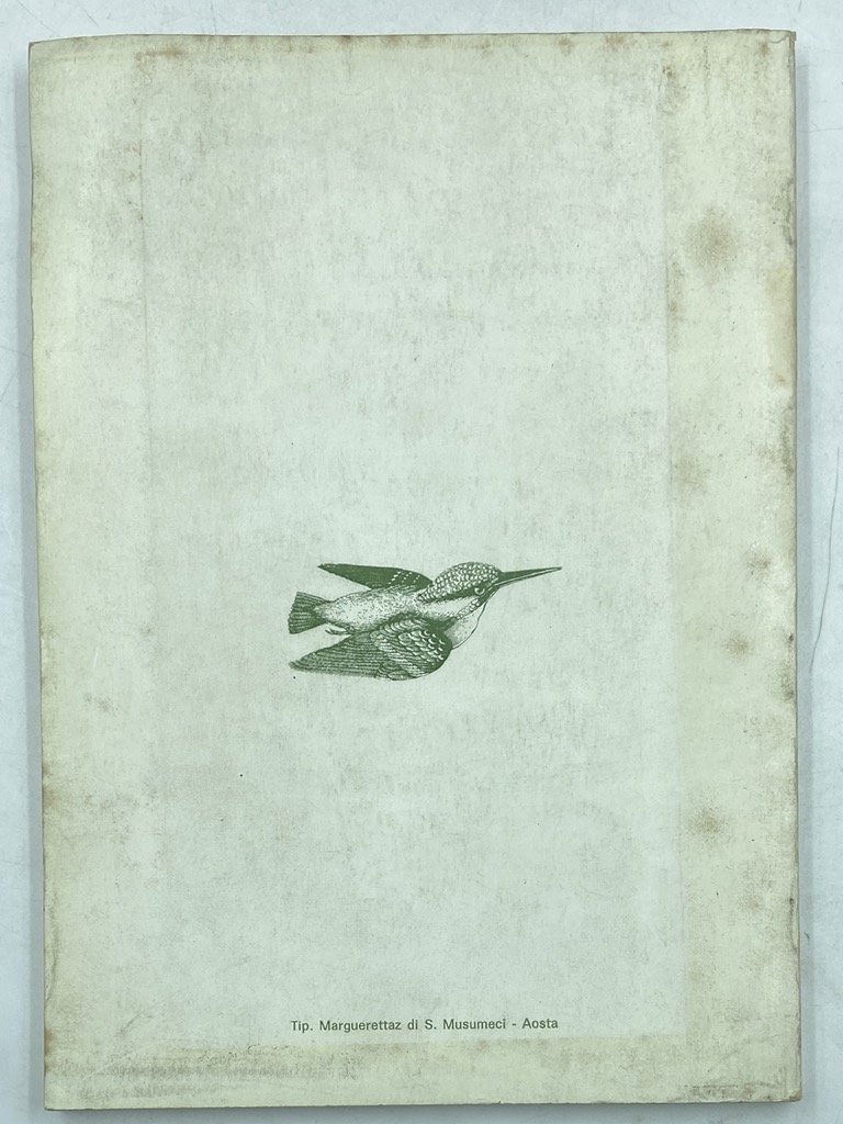 Brossura editoriale illustrata, cm 23 x 16.5, pp 147 (5); alcune figure in monocromia. Segni del tempo sulla copertina. Raccolta di brevi scritti sulla caccia in Valle d'Aosta, che alterna descrizioni faunistiche, memorie e considerazioni venatorie, racconti.