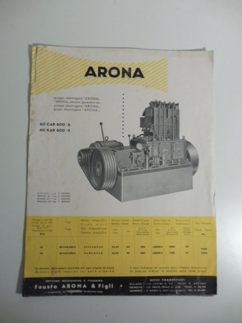 8 tavole (cm 21 x 28) fermate da punto metallico con grandi illustrazioni e caratteristiche tecniche dei gruppi elettrogeni prodotti dalle Officine meccaniche e fonderie Arona.