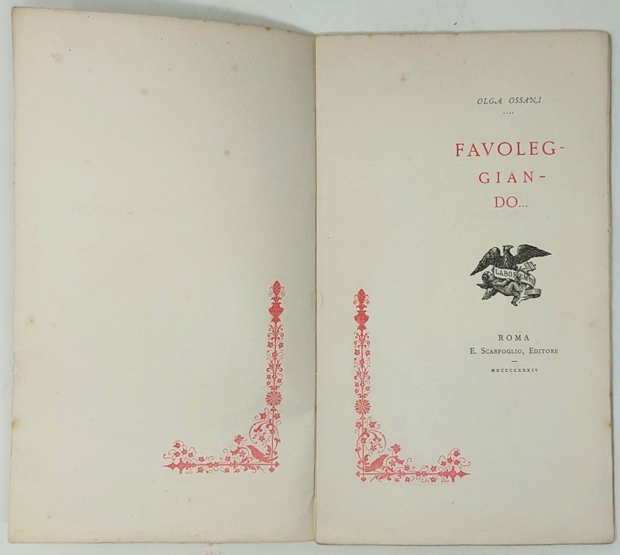 >in-8 piccolo, pp. 28, (4), tutte figurate con graziose cornici angolari in rosso. Broch. editoriale figurata a colori. Edizione originale, impressa in sole 150 copie. Rarissima. Include Fiaba Bianca e Fiaba Rossa a sfondo nero, o Carbonilla (nome che fu poi uno dei numerosi pseudonimi di Ossani, che si firmò anche Diego De Miranda, La donna bianca e Febea), due opere giovanili di gusto romantico gotico. Olga Ossani fu giornalista e attivista per il suffragismo e la questione femminile, scrittrice e buona amica di intellettuali quali Trilussa, Mascagni, Pirandello, D'annunzio e le sue care amiche Maria Montessori, Matilde Serao, Eleonora Duse e Grazia Deledda. Buon esemplare, fioriture sparse.