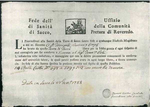 Fede dell'Uffizio di Sanità della Comunità di Sacco, pretura di Roveredo. Li provveditori alla Sanità della Terra di Sacco fanno fede a qualunque Illustris. Magistrato a cui ec. Siccome Li A. Fedrigotti, Baroni e Comp. ha levato da questa terra di Sacco