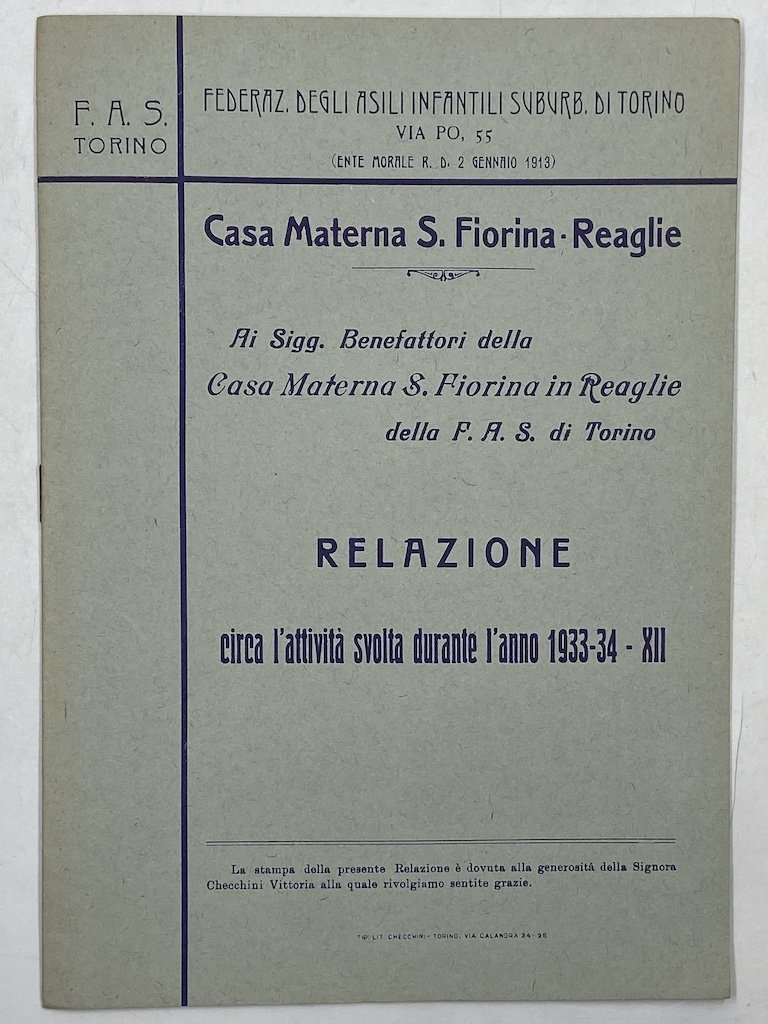 FEDERAZIONE ASILI INFANTILI SUBURBANI DI TORINO. CASA MATERNA S. FIORINA REAGLIE. RELAZIONE CIRCA L’ATTIVITÀ SVOLTA DURANTE L’ANNO 1933-24.