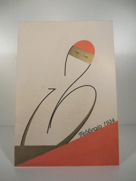Cartoncino a due falde, cm 10 x 30, illustrato al fronte in arancio, nero e oro. Testo dell'invito nella parte interna delimitato da 2 losanghe in verde. Nicola D'Arcangelo (vero nome che venne latinizzato in De Arcangelis) e' stato un caso anomalo di stampatore d'arte e graphic designer. Figlio di tipografo, raffino' la sua arte costruendo uno stile che insieme al rigore e all'eleganza dell'antica tipografia univa il sentire delle avanguardie (futurismo, l'illustrazione deco' ecc.) e che bene si espresse nei suoi famosi calendari e nella stampa d'occasione.